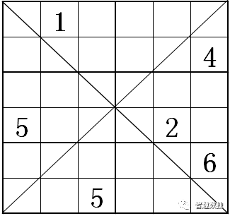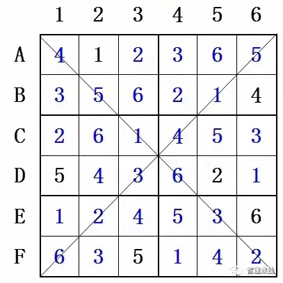 规则:在标准6阶标准基础上(行列宫都有1-6,不重复)对角线同样要求不重复