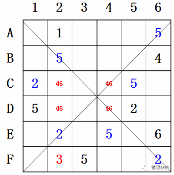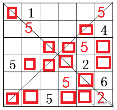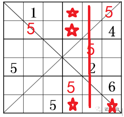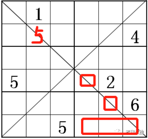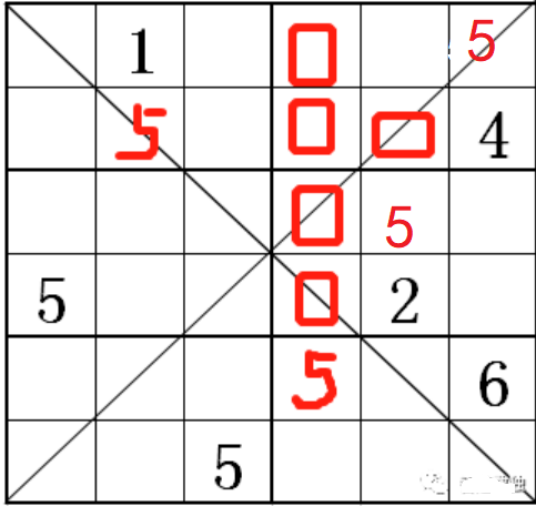 从B2的5和E4的5排除红色框框填5,第二宫就有A5、A6两个位置可以填5,但根据对角线法则,发现5必须填在A6位置。最后根据A6和E4格对四宫进行排除,得到C5格填5。至此,本题中的所有的5就填完了。