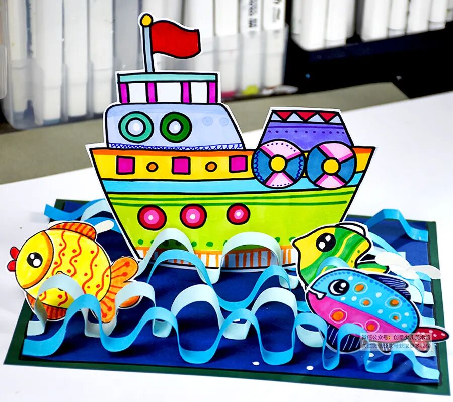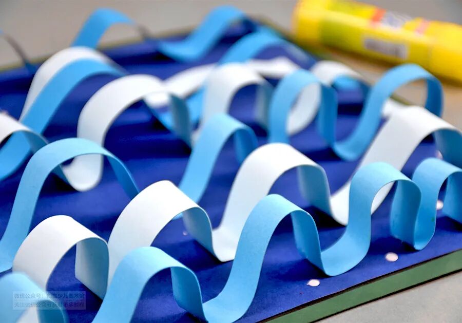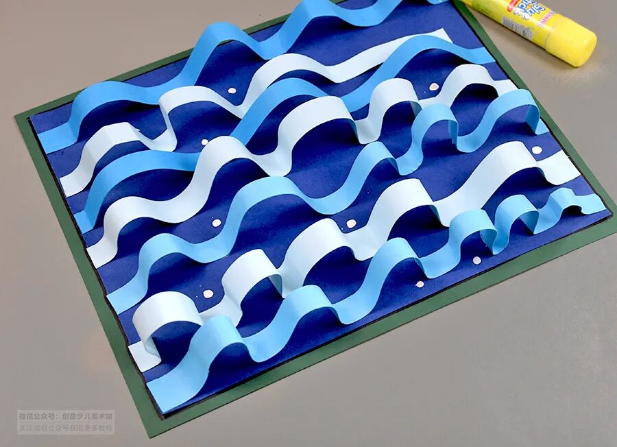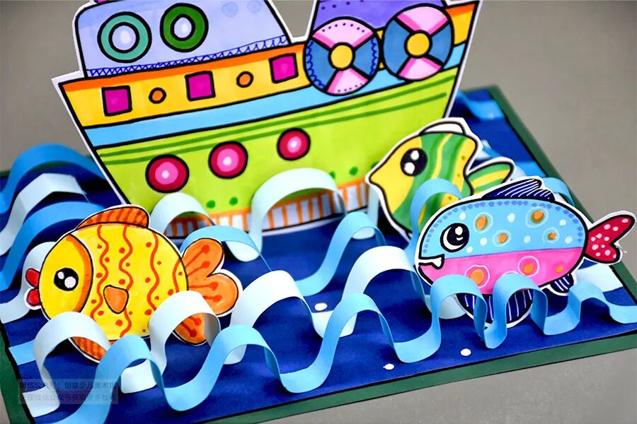 2.用剪纸的方式表现海浪起伏的线条感,并展开丰富的想象描绘出不同种类的鱼儿,巧妙地塑造出一幅半立体创作。