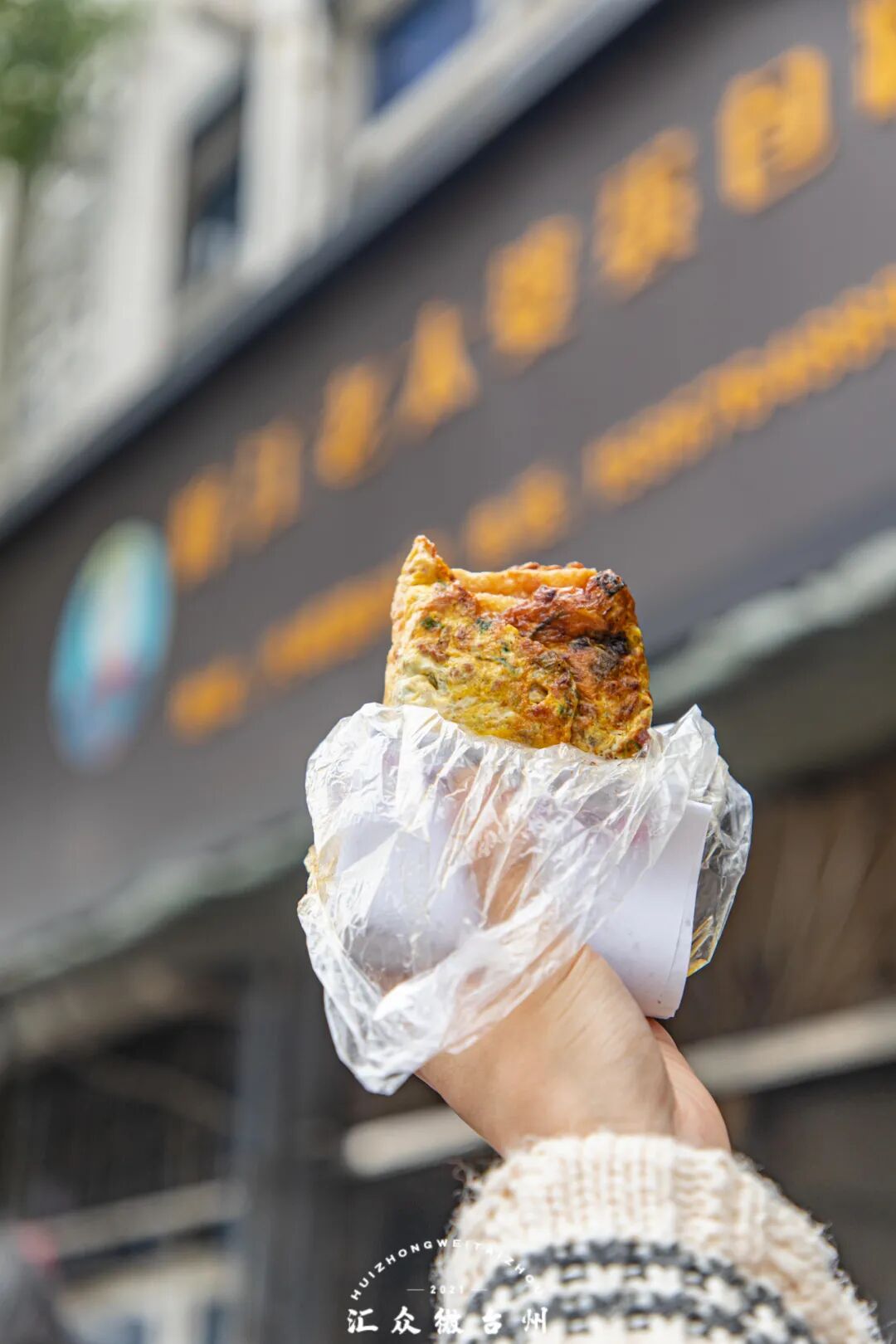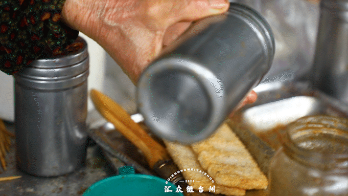 蛋液入锅,摊成薄薄的椭圆形。趁着蛋液咕噜咕噜冒泡的时候,阿婆会给炸好的年糕撒粉刷酱调味。这是阿婆的独特调制,别处寻得的都不是这个味。