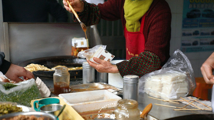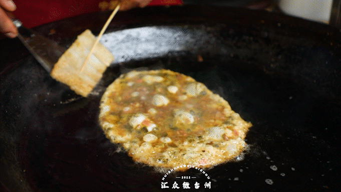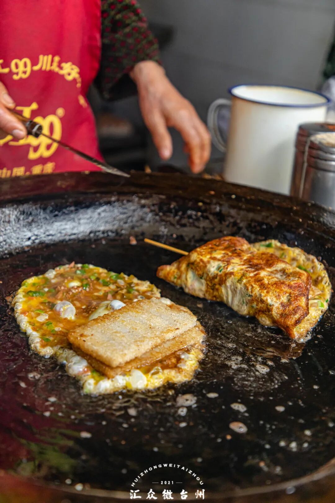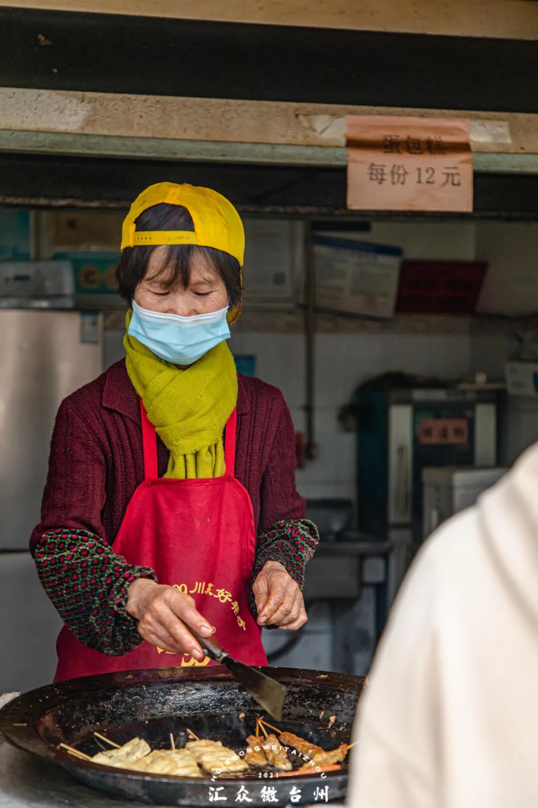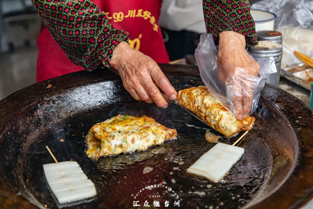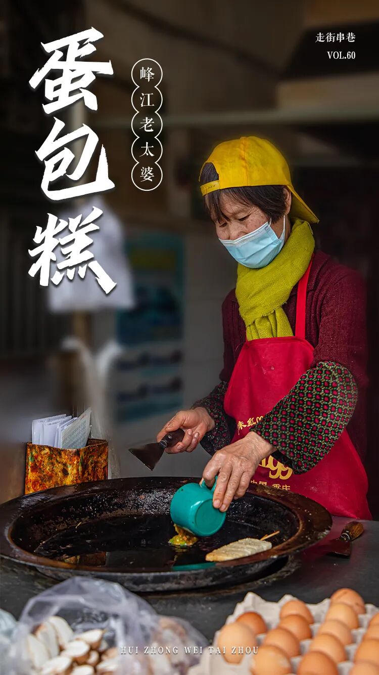 据阿婆说蛋包糕的做法是她自创的,没想到这种小吃做法受到了超多吃货的认可,后来多了很多的模仿者,于是<蛋包糕>就火了。现在蛋包糕已经成为了台州街头的小吃,会做蛋包糕的店铺遍地开花。但<峰江老太婆蛋包糕>依然是那个特别的存在。大铁盘前,一站就是三十多年。