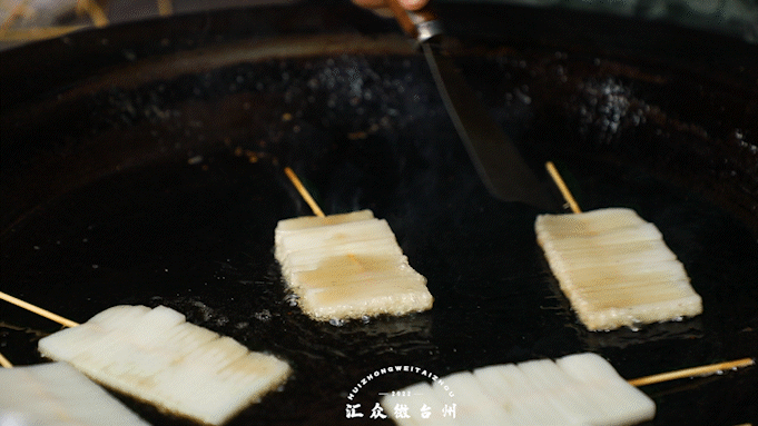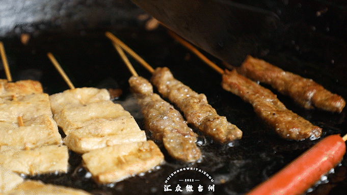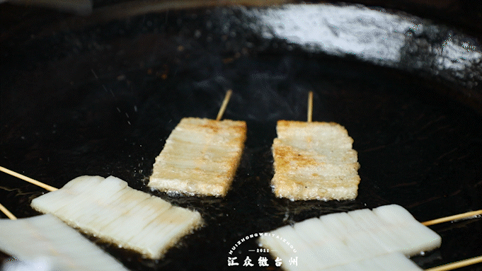 同时,阿婆这边已经开始炸年糕、炸肉串。听着油锅里滋滋冒响的声音,口水已经不自觉开始分泌出来。