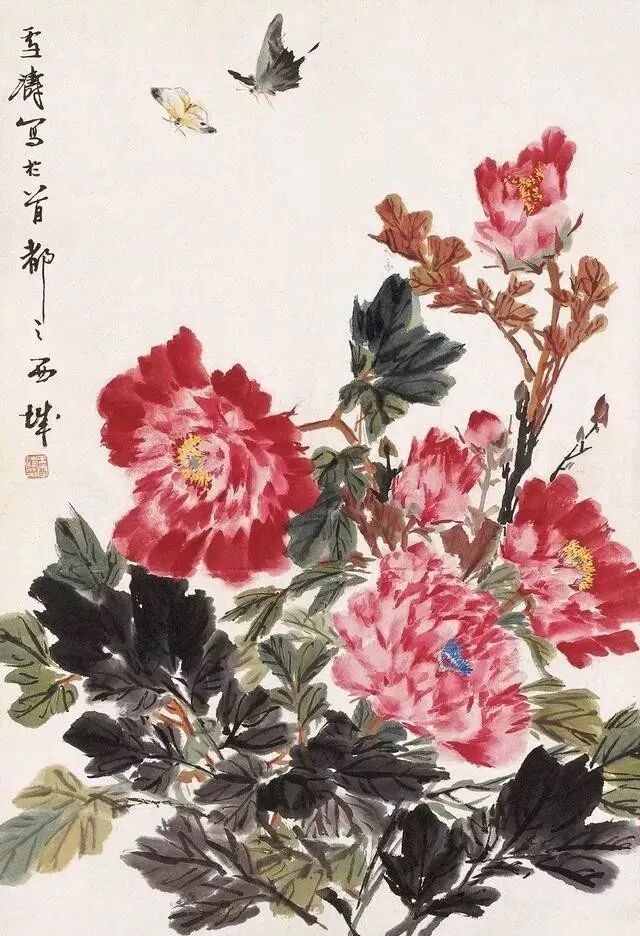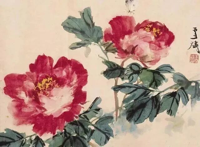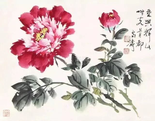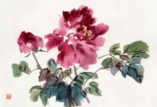 如果想追求丰富多变的花瓣形象,就必须在用色时中锋、侧锋,逆锋,拖笔等多种笔法并用,单一的点法,必然显得花瓣雷同。画红牡丹花,一旦配以绿叶,对比太强烈了,就使人感到俗气。为了使画面稳定而脱俗,就应该用水墨画叶子,压住火爆局面,取得视觉上色彩平衡。这样才能够“艳而不俗”。