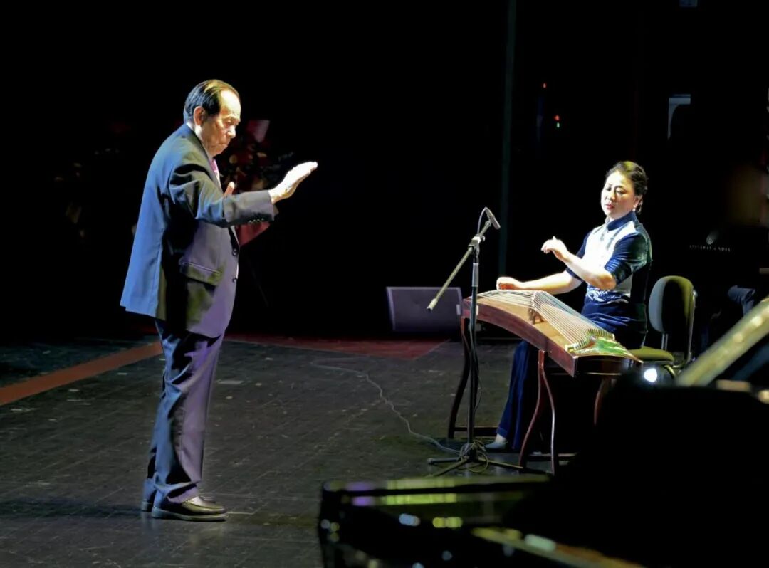 随后,音乐会的重头戏——古筝合奏《梁祝》震撼上演。这首由何占豪与陈钢创作的同名小提琴协奏曲改编而来的古筝作品,以其凄美的故事情节和动人的音乐旋律,深深触动每一位听众的心弦。值得一提的是,本次音乐会的特邀艺术指导与指挥、著名作曲家何占豪先生亲自执棒,与陈爱娟女士及九紫筝乐团共同演绎这一经典之作。这是时隔三十一年,何占豪先生与陈爱娟女士再度同台共奏《梁祝》,这份情怀与意义无疑为音乐会增添一抹不可复制的光彩。