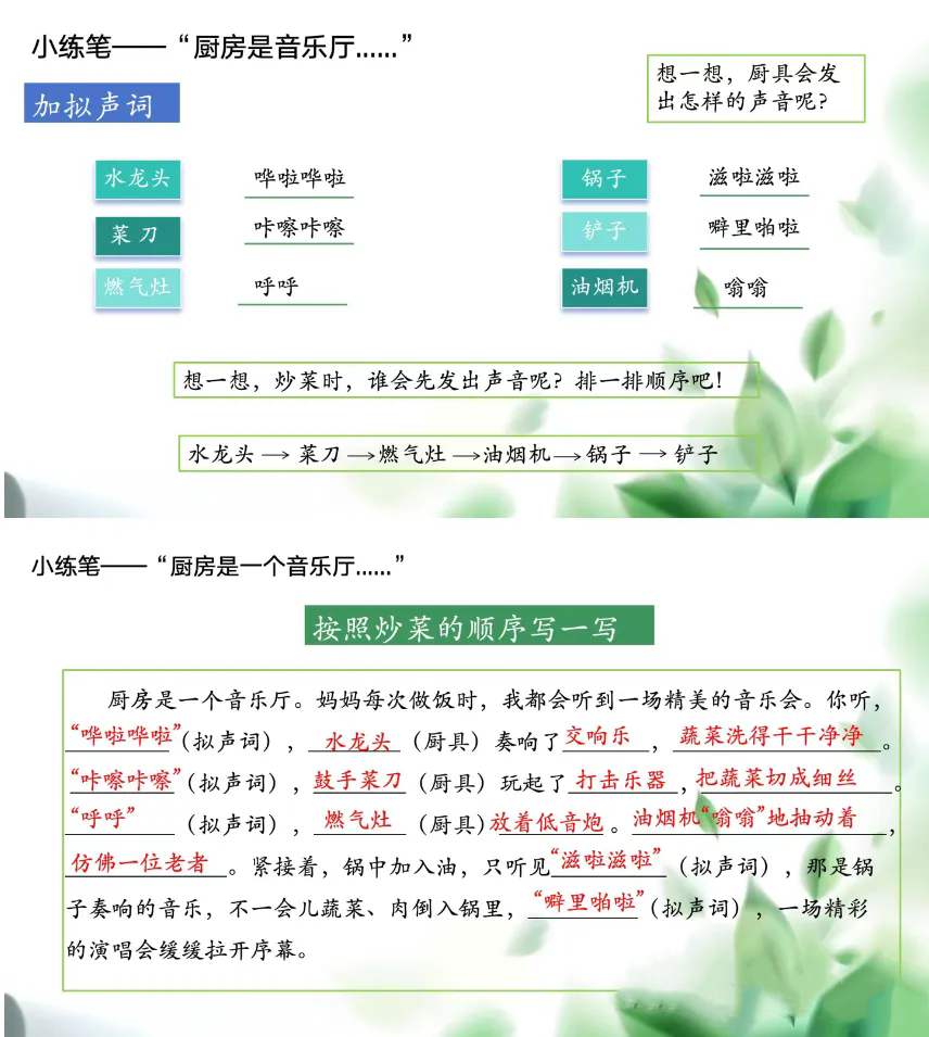 厨房是一个音乐厅,正在开一场演唱会。水龙头是一位调音师,打开水龙头,自来水奏响了音乐会的前奏,“哗啦哗啦”,给青菜和水果洗了个冷水澡。菜刀和案板是好朋友,他们一起敲着鼓,“咚咚咚”。欢快地把蔬菜切成丝。接着高音歌唱家油出场了,“滋啦滋啦”唱着高昂的旋律。妈妈把蔬菜放入油锅内,拿起铲子,“噼里啪啦”地翻滚着,合奏出一曲优美的乐章。鸟儿是大自然的歌手。草原因为百灵鸟的歌声显得生机勃勃;沉睡的森林在群鸟的鸣叫声中苏醒;城市中的公园就是只有几只叽叽喳喳的麻雀,也会显出几分活跃。 大自然的声音仿写雨是大自然的演奏家。一阵狂风吹过,哗哗哗,哗哔哗……雨像一曲奇妙的歌谣,悄悄地从四面八方飘然而起,逐渐清晰起来,响亮起来。雨声里,山中的每一片树叶、每一丛绿草、每一块岩石,都变成了神奇的琴键,飘飘洒洒的雨丝是无数轻捷柔软的手指,弹奏出一首又一首优雅的小曲……青蛙是大自然的歌手。雨后,岸边的石头便是他们的歌台。听,他们开始唱了:“呱呱,呱呱,呱呱呱……”一个在唱,另一个也跟着唱,第三个,第四个……直到由独唱变成了大合唱。他们也喜欢在晚上,躺在荷叶上唱歌,这个一句,那个一句,简单的对唱里,藏着他们快乐的心。鸟儿是大自然的歌手。麻雀在屋檐下叽叽喳喳,像是在热烈地讨论着一天的趣事。黄鹂鸟站在枝头,歌声清脆悦耳,宛如一串串美妙的音符。啄木鸟用它尖尖的嘴巴敲击树干,发出“笃笃笃”的声音,仿佛是在为大树演奏独特的打击乐。这些鸟儿的歌声交织在一起,共同奏响了大自然生机勃勃的乐章。鸟儿是大自然的歌手。鸽子是大自然的和平使者,它们扑棱着翅膀,发出“咕咕”的声音,仿佛在诉说着对世界的美好祝愿。喜鹊是大自然的报喜精灵,“喳喳”的叫声欢快而明亮,像是在传递着幸福即将来临的消息。杜鹃是大自然的浪漫歌者,它的歌声清脆婉转,“布谷布谷”,为春天增添了一抹诗意的色彩。厨房是一个音乐厅。水龙头是出色的鼓手,当它打开时,“哗哗”的水流声就像激昂的鼓点。锅铲是灵活的吉他手,在锅里翻炒食物时,“嚓嚓”声如同欢快的吉他弹奏。抽油烟机是有力的贝斯手,“嗡嗡”声低沉而有节奏。微波炉是神奇的电子琴手,“叮”的一声提示音,仿佛是一段美妙的旋律结尾。厨房里的这些声音共同奏响了一曲充满生活气息的动听乐章。厨房是一个音乐厅。水龙头是出色的鼓手,当它打开时,“哗哗”的水流声就像激昂的鼓点。锅铲是灵活的吉他手,在锅里翻炒食物时,“嚓嚓”声如同欢快的吉他弹奏。抽油烟机是有力的贝斯手,“嗡嗡”声低沉而有节奏。微波炉是神奇的电子琴手,“叮”的一声提示音,仿佛是一段美妙的旋律结尾。厨房里的这些声音共同奏响了一曲充满生活气息的动听乐章。 大自然的声音仿写