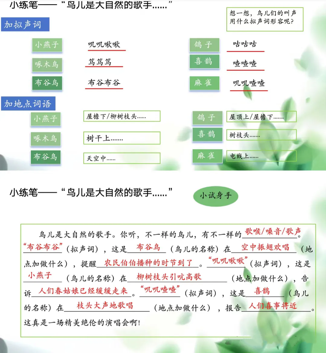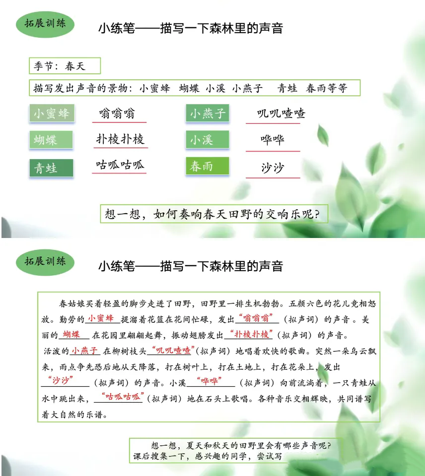 例6:走在公园里,听听树上叽叽喳喳的鸟叫;坐在一棵树下,听听唧哩哩唧哩哩的虫鸣;在水塘边散步,听听青蛙的歌唱。