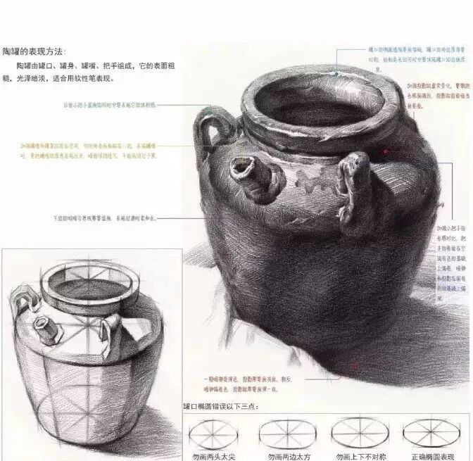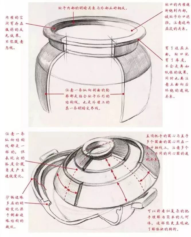 第二个大点我们来说一些罐子上容易忽略的小细节,首先是罐口的厚度,罐子口是一个难点,很多同学不会处理它的转折和厚度。简单来说,罐子口无非就是多几个面,我们在画结构素描的时候应该就要解决这个问题,只要你学会了如何分析,如何解剖一个静物的形体,那再难的结构都是很容易处理的。而且罐子口的转折也非常明确,不是那张很圆润的过渡,而是很直接的,所以画的时候要胆大心细。