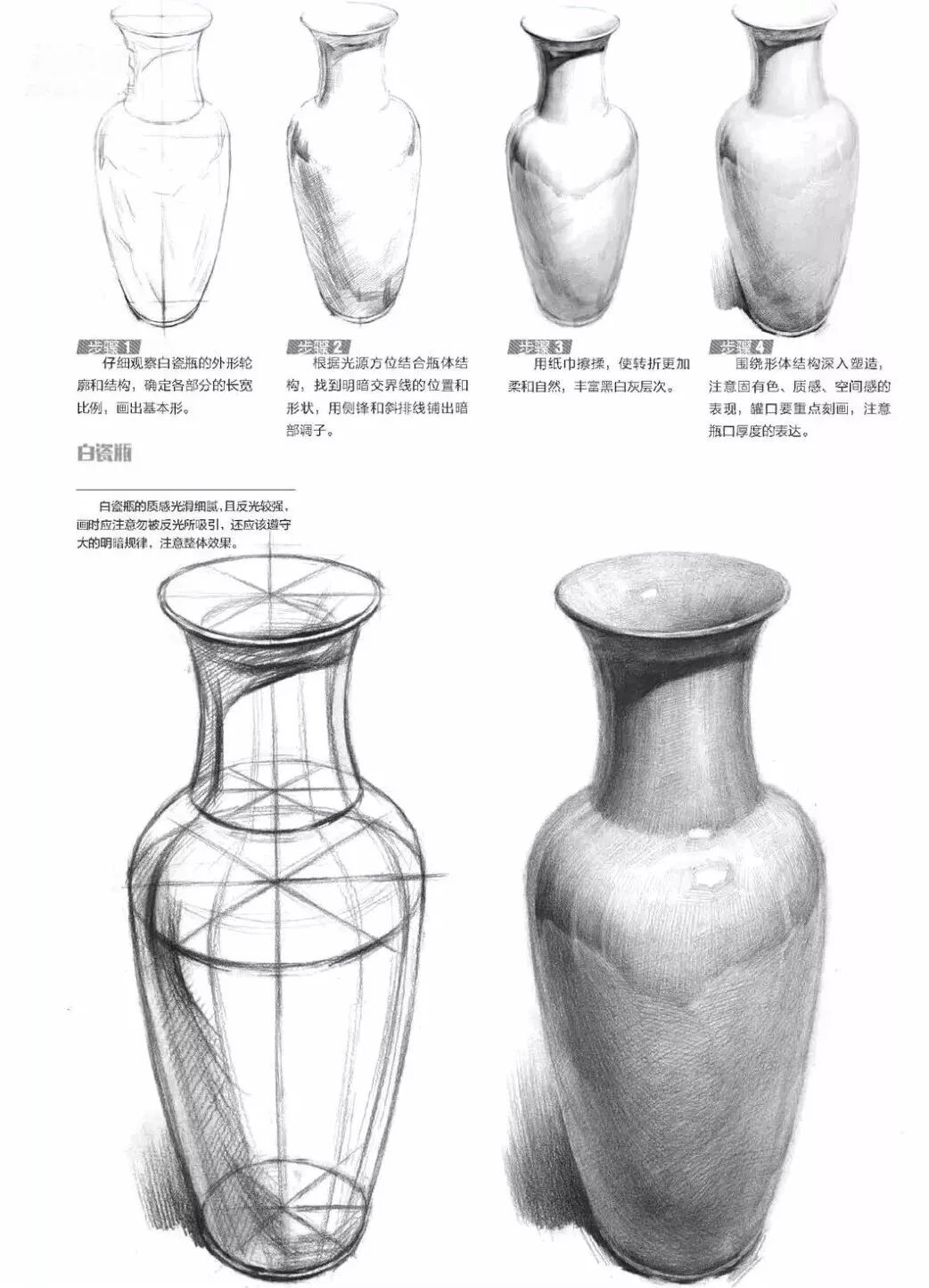 比较白的罐子在画的时候就要温柔一点,首先还是要找到明暗交界线,然后再围绕形体结构深入塑造,白色的瓷罐子质感比较光滑细腻,反光会非常强,画的时候不要被反光吸引,先要把整体效果做出来,再去画一些细节的部分。