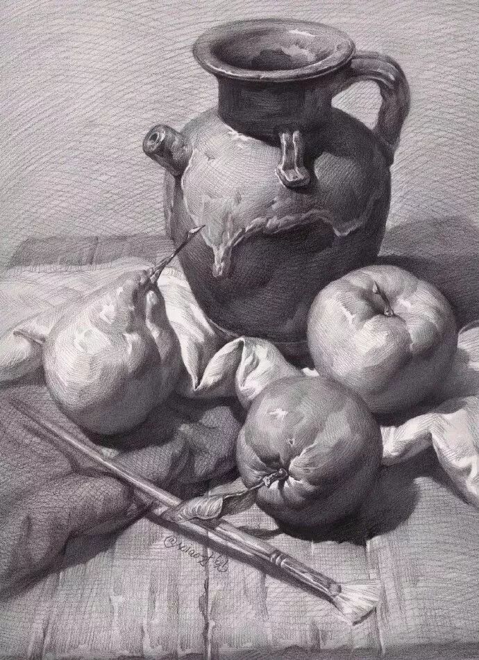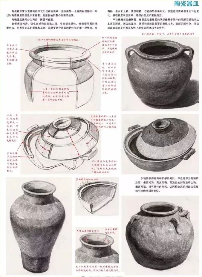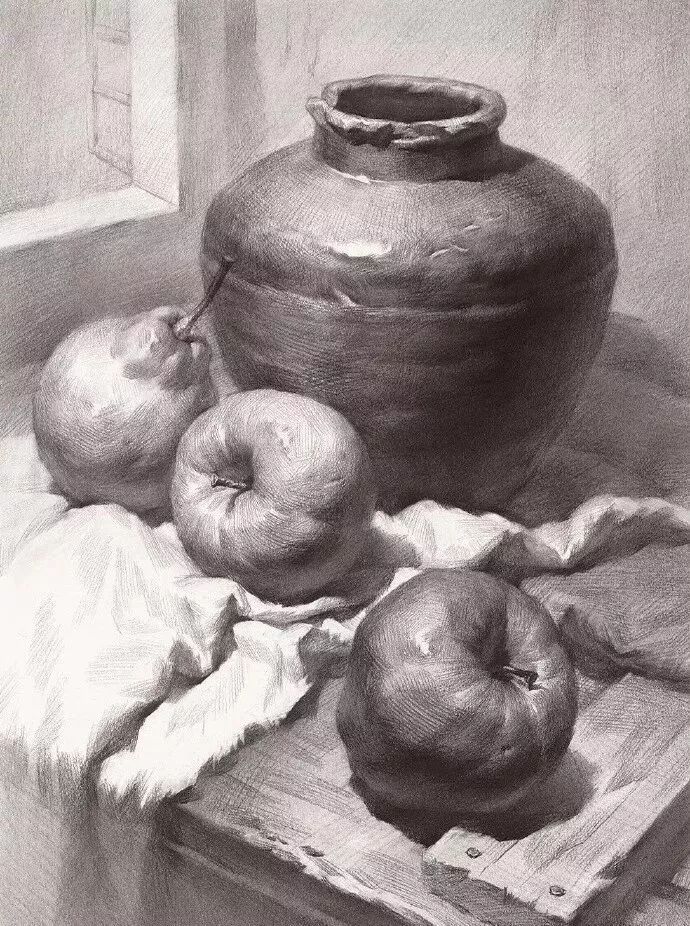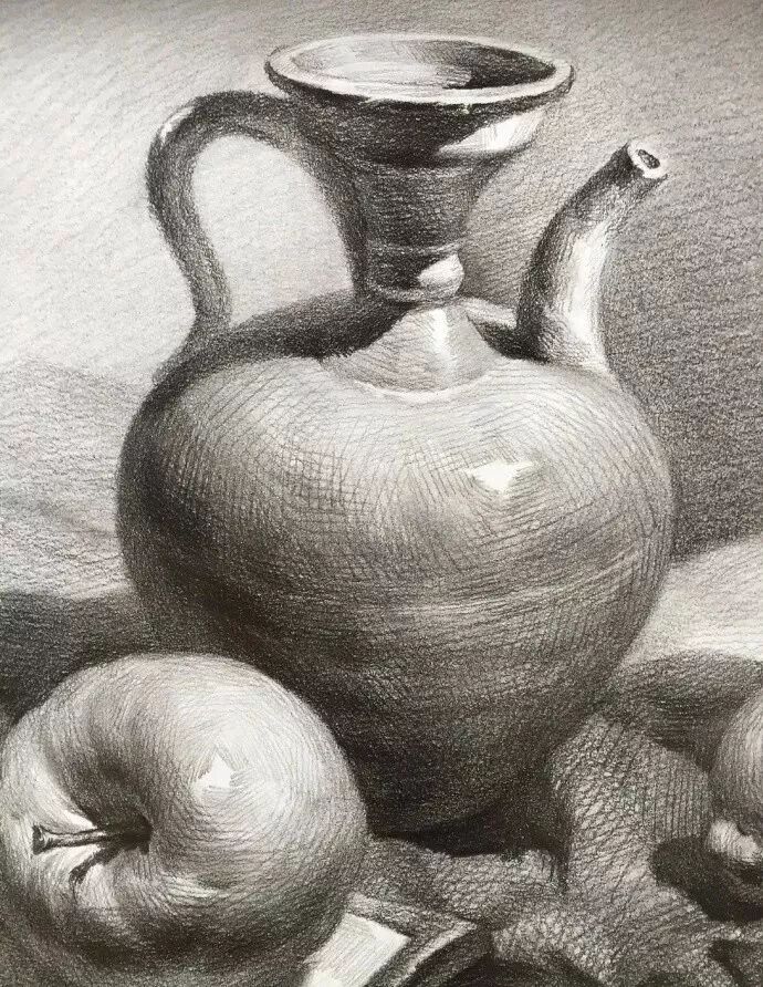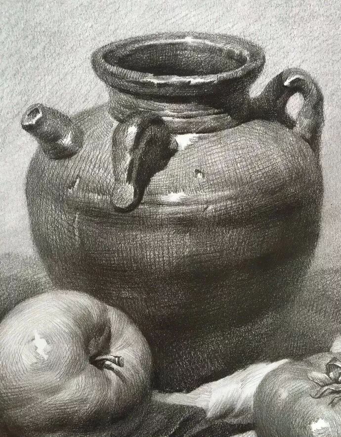 然后我们来简单的聊一聊罐子质感的问题。一般罐子分为两种,一种是瓷罐子,质感上比较硬,质地光滑,吸光能力与反光能力强,高光比较强,同时暗部会有很明显的反光,这个时候就要注意它周边物体在反光上的形体。另一种是陶罐,质地粗糙,反光能力也比较弱,画这类罐子的时候要把质感处理得粗糙一点,暗部反光不能太强。当然我们也可以主观的去处理这些关系,画面合理、舒服即可。