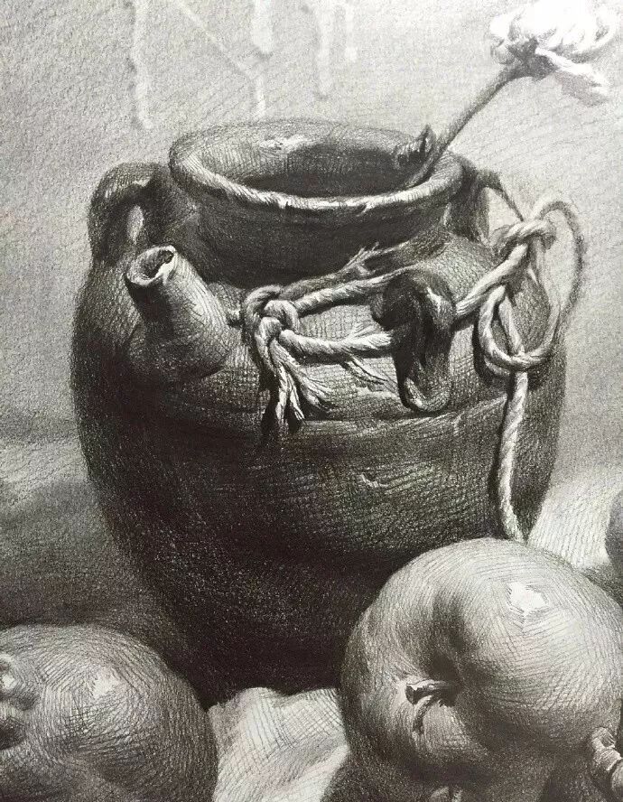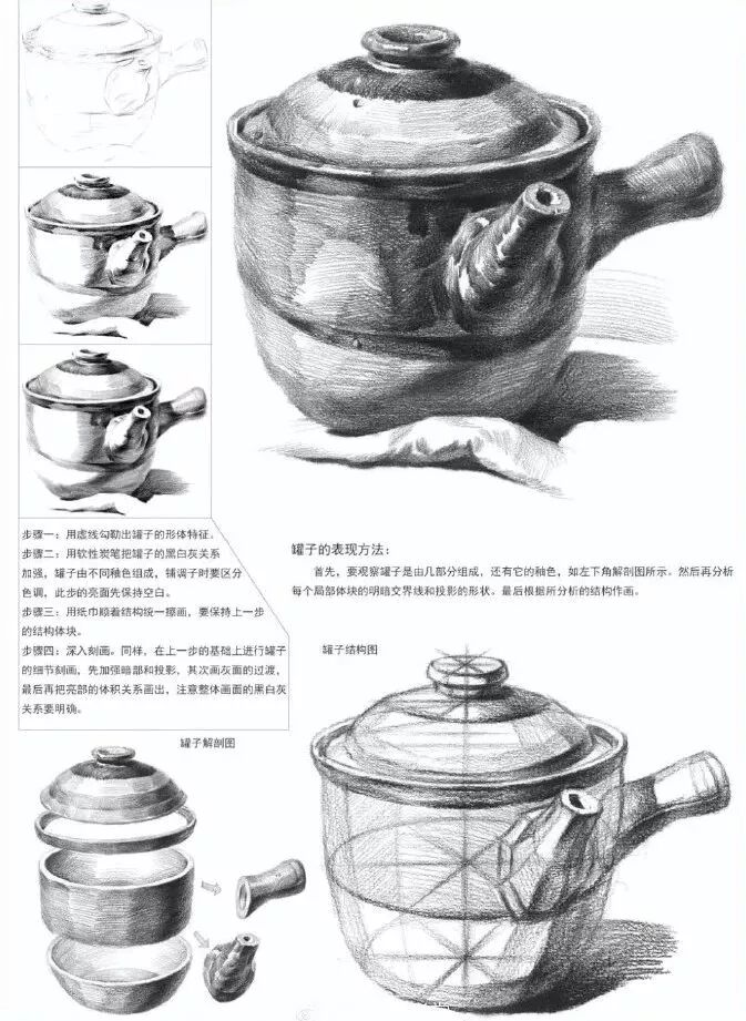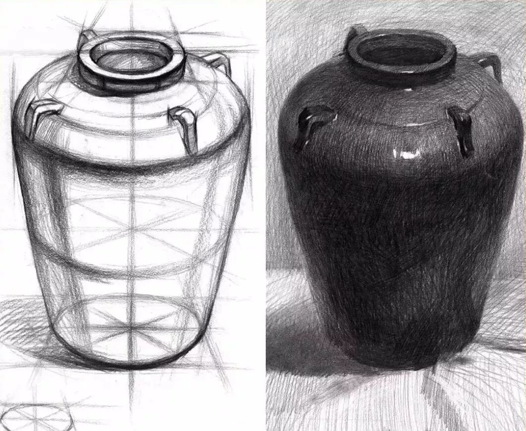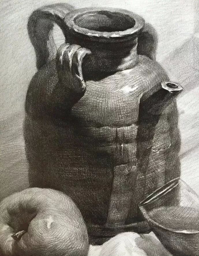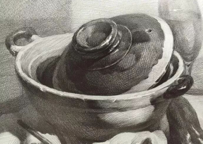 如果遇到下图中这种比较复杂的罐子也不要着急,首先我们通过分析形体结构来画这个罐子会比较好,整体来说就是一个圆胖的圆柱体和下面的罐身组成,然后我们再去找上面的细节。这个时候要画明暗交界线相对就复杂一些,因为形体上的变化多,明暗交界线的变化也会增多,一定要有耐心,不要把这些变化画得太简单,在保持整体作画的过程中去增强细节的变化,既统一又丰富会使画面非常耐看。