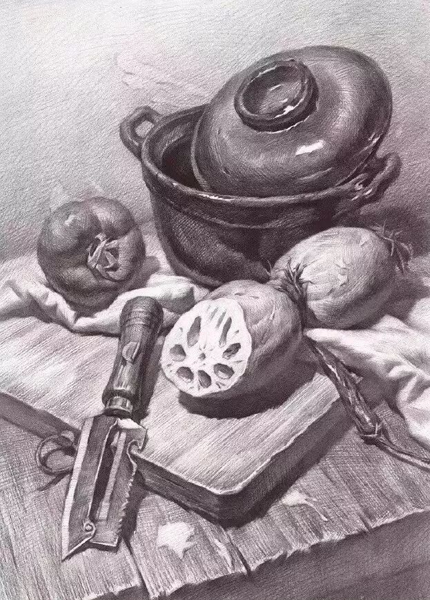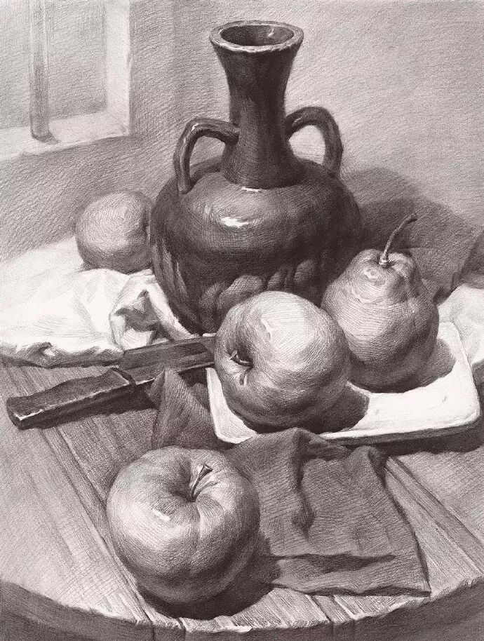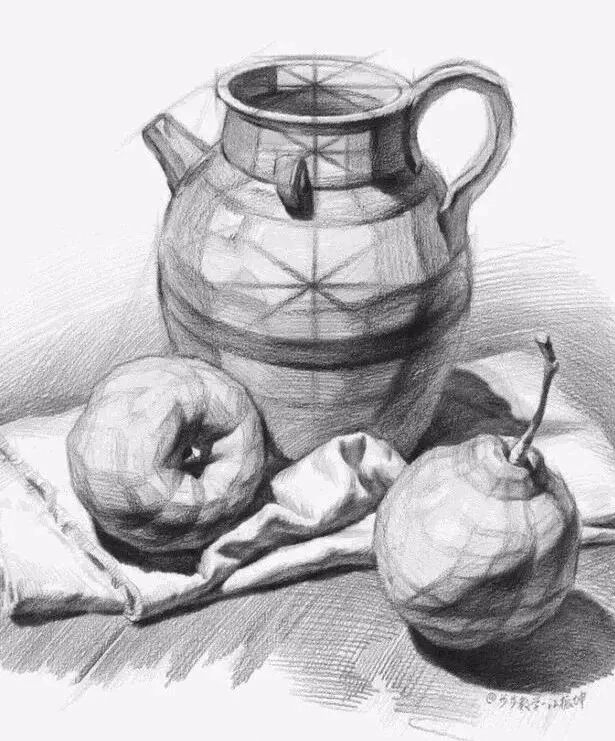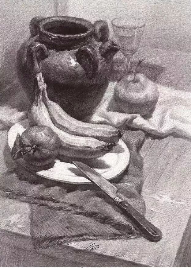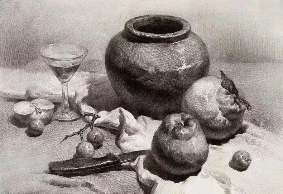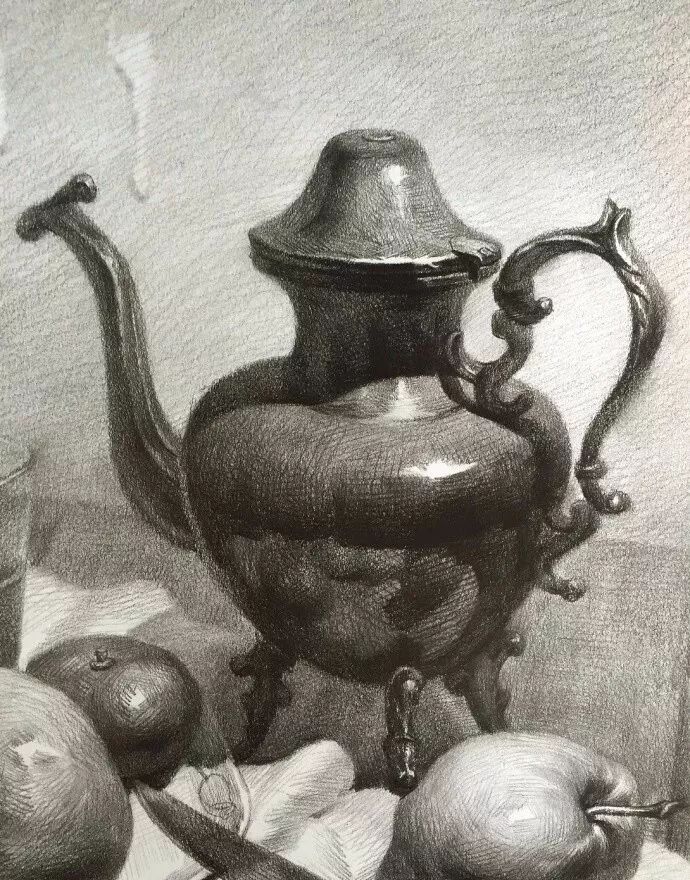 如果遇到下图中这种比较复杂的罐子也不要着急,首先我们通过分析形体结构来画这个罐子会比较好,整体来说就是一个圆胖的圆柱体和下面的罐身组成,然后我们再去找上面的细节。这个时候要画明暗交界线相对就复杂一些,因为形体上的变化多,明暗交界线的变化也会增多,一定要有耐心,不要把这些变化画得太简单,在保持整体作画的过程中去增强细节的变化,既统一又丰富会使画面非常耐看。