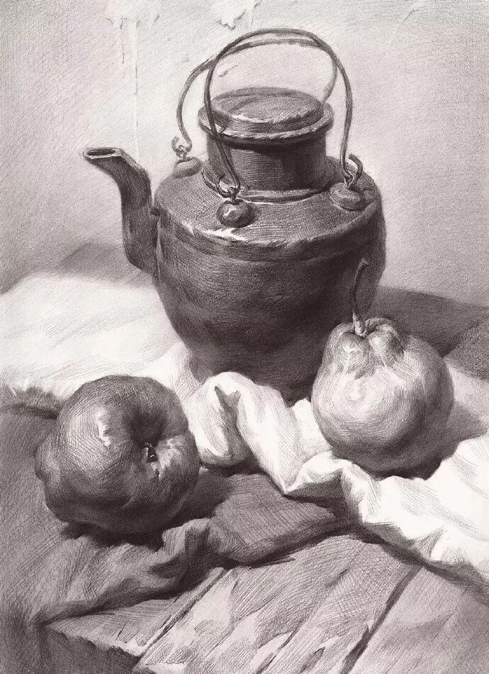 接着我们聊一下罐子的作画步骤,其实作画步骤基本都大同小异,先找形,然后找明暗交界线,再塑造,最后调整画面。基本的要求就是形体、透视、质感表达准确,然后要注意整体的黑白灰关系。但是在作画过程中还有一个很重要的知识点就是固有色,如果说你画得罐子本来就很黑,那我们在画的时候还是先把明暗关系处理好之后再去把静物的固有色加深。而不是先把罐子画黑再找素描关系。
