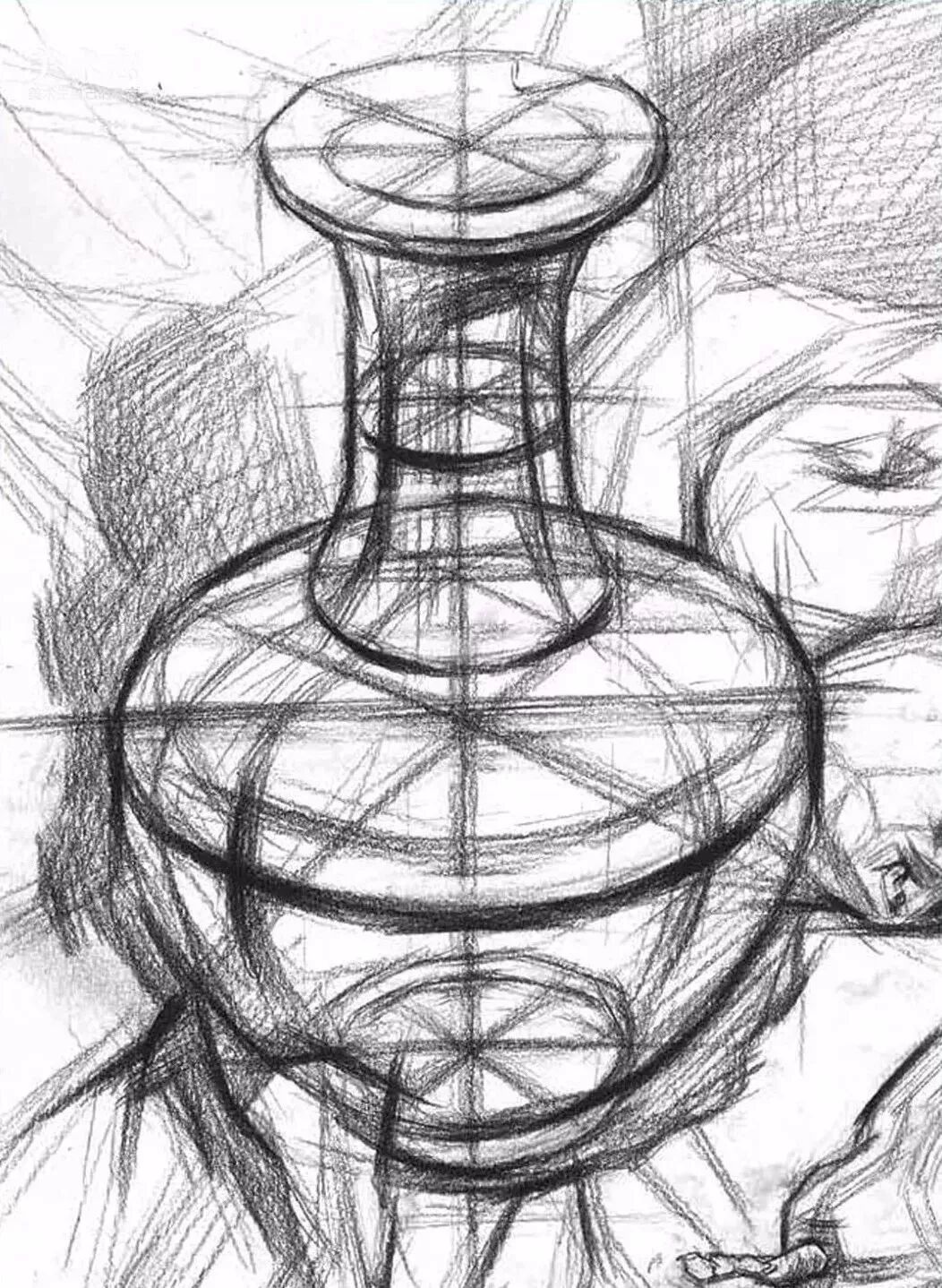 第二点是在画罐子结构的时候,我们需要先找到罐子上最宽厚的部分,也就是上下明暗交界线的区域,这个区域一般是很有厚度的,然后也是罐身上最高的地方,找到这个地方画一个结构线,罐子的体积感就会非常强。然后是从上至下的结构线变化也是很丰富的,因为有一些罐子的外形的起伏还是很大,所以这类线条要依据实际情况去画。把这两组结构线找好,基本上罐子的外形就能确定。