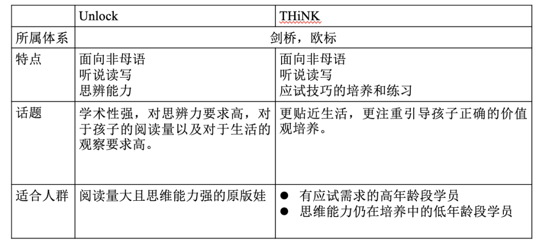 最后,新学期马上开始,和大家分享一点教材选择的心得。教材的选择确实是非常难的过程,因为每一套教材都有优缺点。比如我们一直在说,THiNK里的语法教学会更有体系化一些,Unlock学术性更强一些。只要选择相对适合,或者我们最希望这套教材帮助孩子提升什么方面的能力即可。最关键的是,跟着教材和课程,能够很好地走下去,配合老师和机构执行到位更重要。