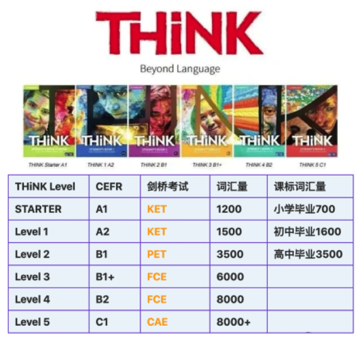 THiNK教材总共6个级别,完全对应剑桥五级考试中的KET、PET、FCE、CAE四个级别的考试,一套教材可以覆盖从3/4年级-大学水平的英语学习。对于参加KET、PET这些考试的学生来说,学习THiNK教材可以让你在冲刺考试时事半功倍 !