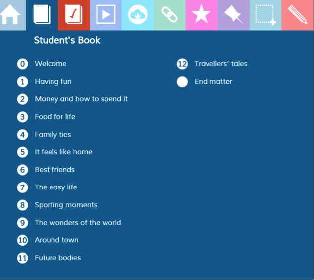 THiNK每个级别分为13个单元,包括12个单元和1个欢迎单元。每个单元6课时,包括:课堂引入、两个阅读练习、口语练习、两个语法点、两个词汇部分、文化部分或图片故事、日常用语练习。