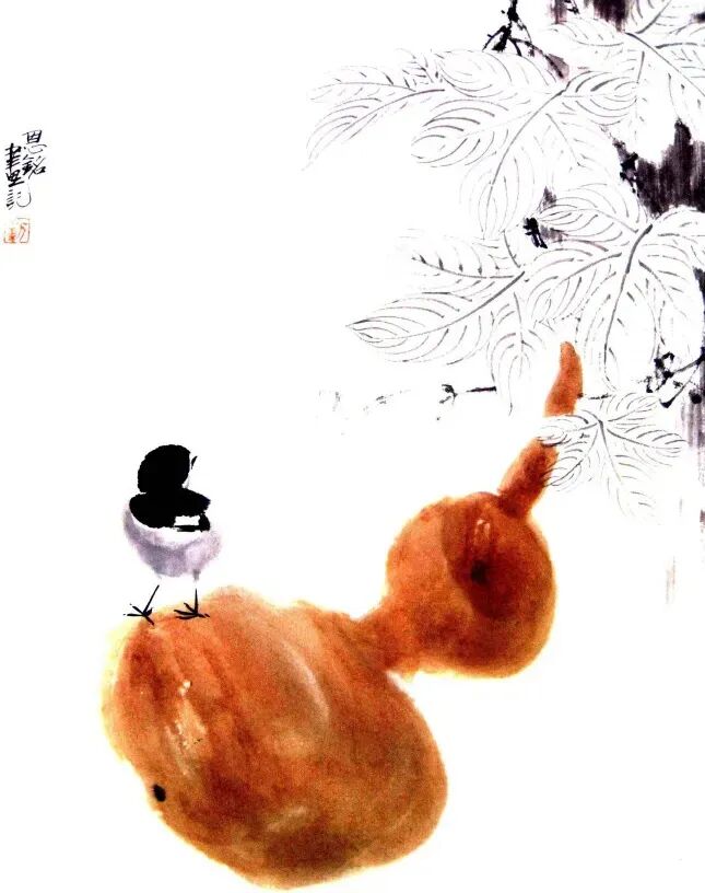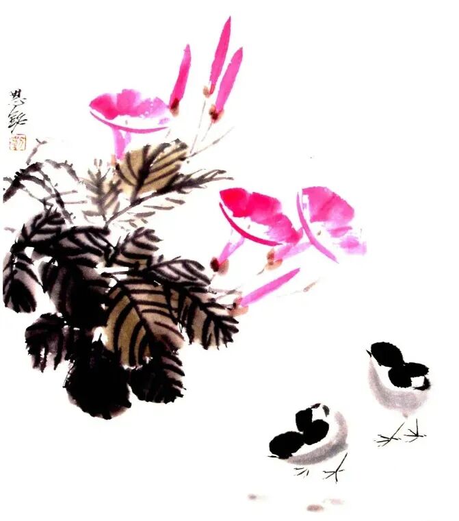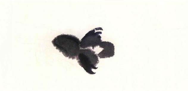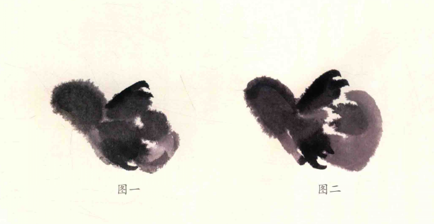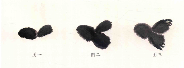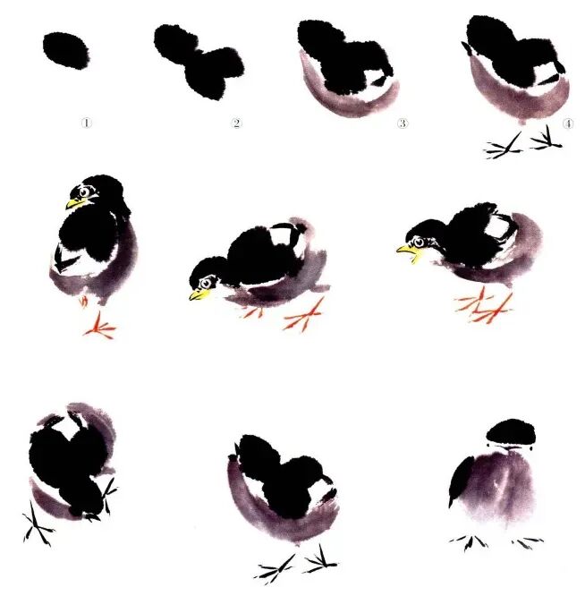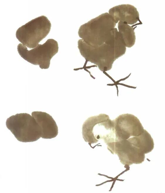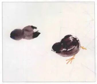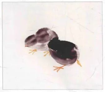 大笔用湿墨几笔画出背部及臀部,后画头部和胸腹﹐干时勾出小嘴、脚趾,浓墨点晴,注意墨色变化画出雏鸡活泼好动,毛绒可爱之感。