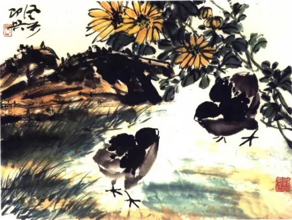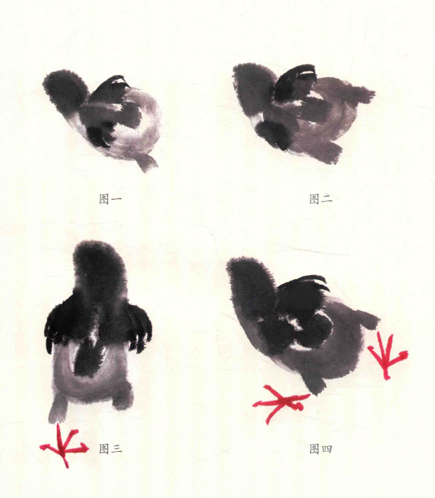 小鸡翅膀短,身体肥,基本动态不离蛋形,添爪时要注意它的动态透视变化。画小鸡先用重墨点头,冉画翅,然后淡墨画肚及尾,最后用小笔浓墨画出嘴、眼、爪。
