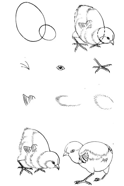 雏鸡因其小,骨骼未长全,尚未形成大鸡状态,务必用心,才能画好。画无定法,你有你法,我有我法,不可强求一种画法。