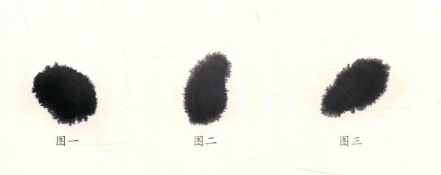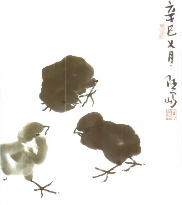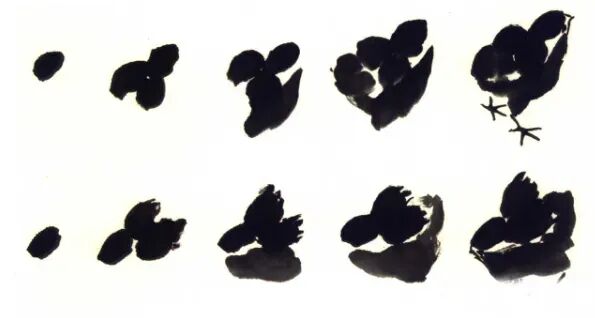 雏鸡非大鸡,它的头一笔即成形,使用加健中白云蘸较浓的墨,自上而下,上小下大,一笔成头状,只见墨的浓淡,不见补笔的痕迹。