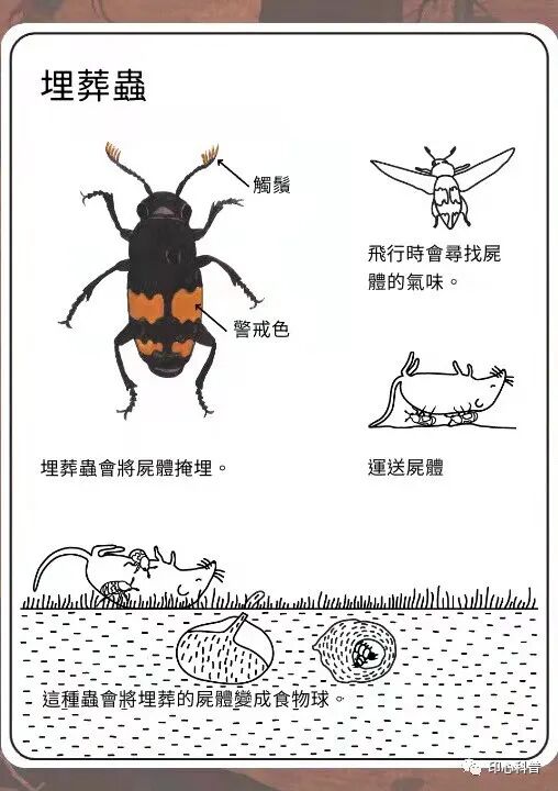 “在地球上,所有的生命,不论是奔跑的小孩、凶猛的老虎、温顺的斑鸠、流浪的青蛙,还是美丽的鲜花,都以我们尚不知晓的某种方式密切相关。如果我们人类不去关心它们,让它们一个接一个地从地球上消失,那么总有一天,这个命运也会落到我们人类的头上。” Vol.1 认识埋葬虫 食尸虫,又叫埋葬虫,属于昆虫中最大的一个目——鞘翅目,埋葬虫科。该科昆虫全世界大约有175种。绝大部分埋葬虫食动物死亡和腐烂的尸体,把它们转化成在生态系统中更容易进行循环的物质,像是自然界里的清道夫,起着净化自然环境的作用 。 Vol.2 大自然中的殡葬师 埋葬虫是标准的腐食性昆虫,成虫或幼虫均以动物的死尸为食,连野外的垃圾堆和臭水沟中,偶尔也可以发现前来觅食的埋葬虫。短棍棒状的触角便是它们用来循味找寻食物的嗅觉利器。 埋葬虫在食动物尸体的时候,常群集于鸟兽尸体旁,总是不停地挖掘尸体下面的土地,最后会自然而然地把尸体埋葬在地下,它们也因此而得名。 埋葬虫的行动不敏捷,徒手捉捕并不困难,但是喜欢采集甲虫的生手却常会因此不慎吃亏。这是由于埋葬虫身上原本便有来自食物环境的腐臭,当它一旦遭受骚扰攻击,还会自尾端排出一大堆粪液,散发出更浓烈恶心的尸臭味来驱敌,所以,有采集兴趣的人不能不格外当心。 Vol.3 本领与智慧 埋葬虫是一种躯体扁平的甲虫,每当它们发现动物的尸体,就会从四面八方赶来,开始挖尸体下方的土。随着土壤越挖越松,动物尸体逐渐下沉,最终就被埋到了土里。 埋葬虫之所以有这样的行为,与其独特的繁殖方式有关。埋葬虫需要在动物的尸体上产卵,这样幼虫孵化后,就可以安心享用腐肉,快速成长了。 Vol.4 进一步感受自然 虽然动物很弱小,但是他们也是大自然的礼物,是顽强生命的结晶。我们不可以随便践踏他们的生命,要去尊重他们,爱护他们,保护每一个有益的动物。就像步甲的“装死”,这不是人类的笑柄,我们要敬佩他们在面临危险时的机智。每一个生命都有存在的价值,伙伴们,我们是不是又一次进一步地了解了自然呢?![]()