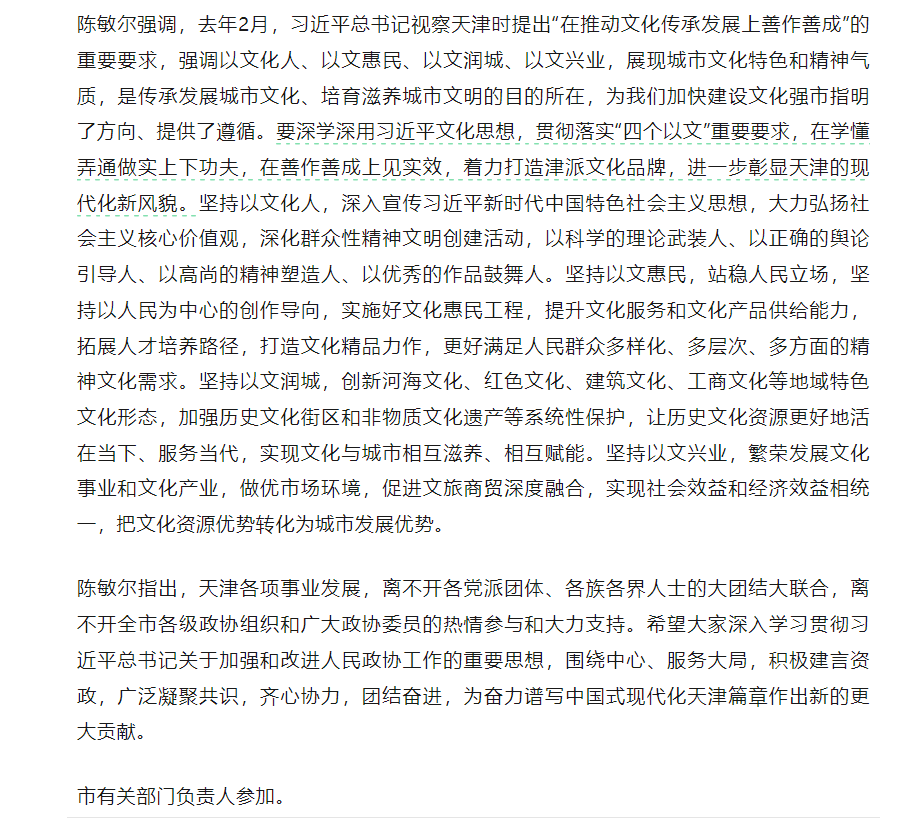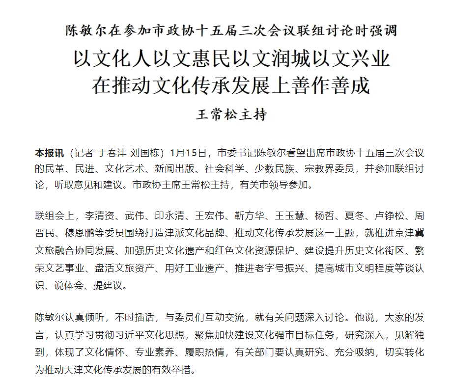 他表示,应进一步加大津派文艺创作扶持激励力度,通过设立专项资金、遴选重点项目、引育文艺人才、奖励精品创作、文旅合作推进等方式,为津派文艺精品创作“孵化”保驾护航,引导天津文艺工作者提升文艺原创力,勇攀创作新高峰。