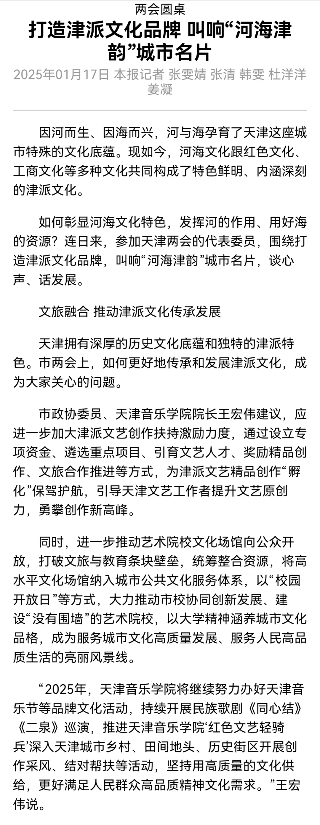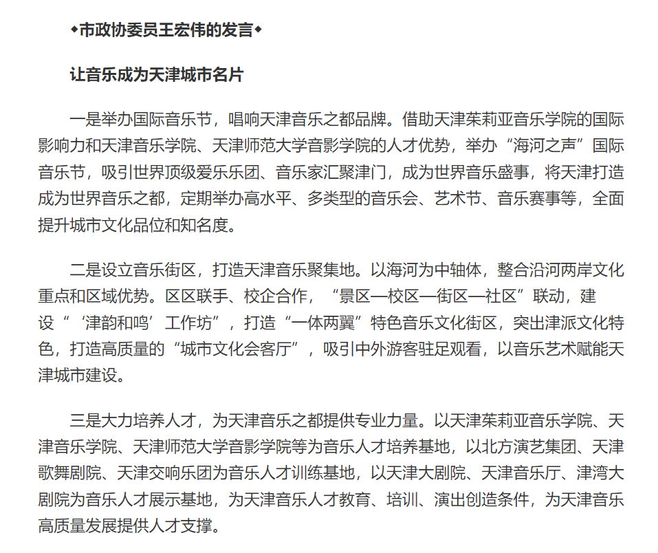 “天津拥有深厚的历史文化底蕴和独特的津派特色。”天津市两会期间,天津市政协委员,天津音乐学院院长王宏伟建议通过举办国际音乐节,唱响天津音乐之都品牌;设立音乐街区,打造天津音乐聚集地;大力培养人才,为天津音乐之都提供专业力量。