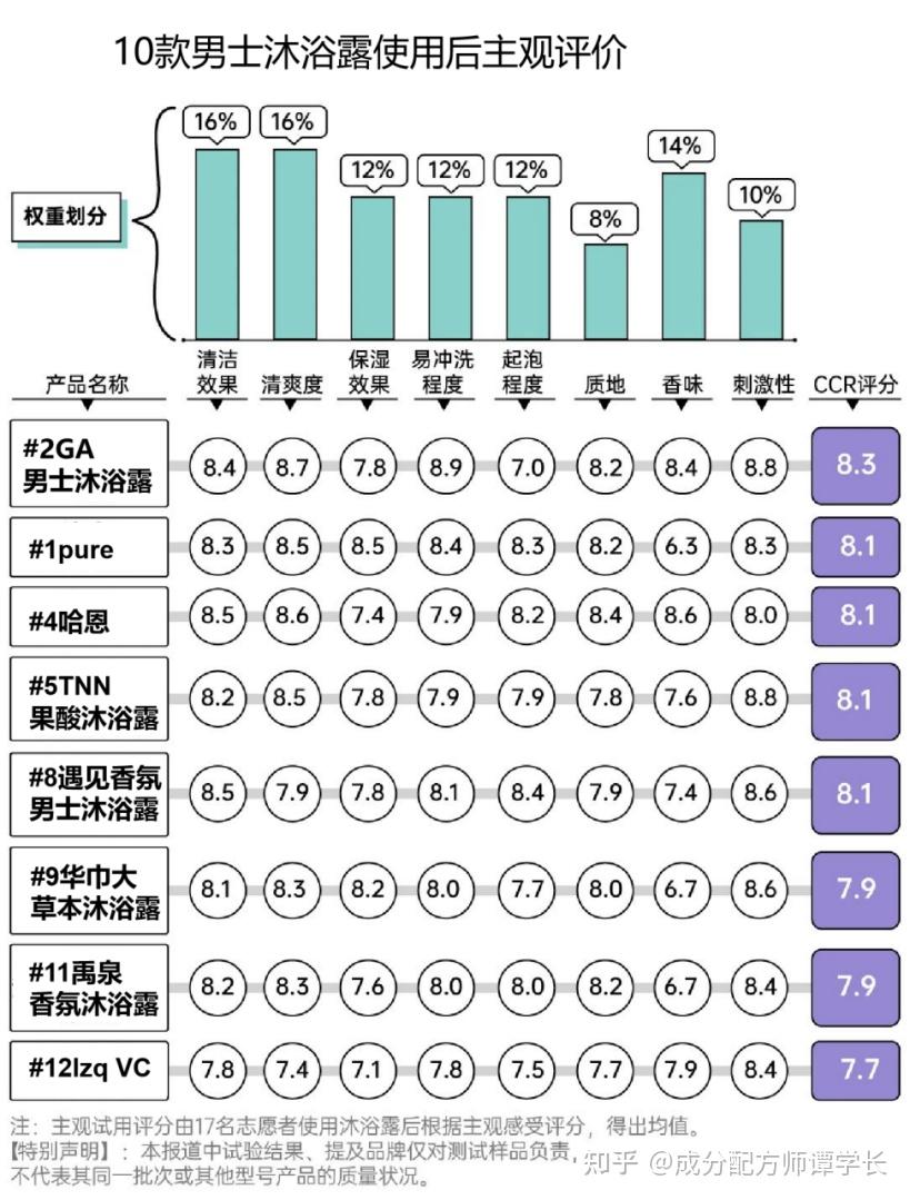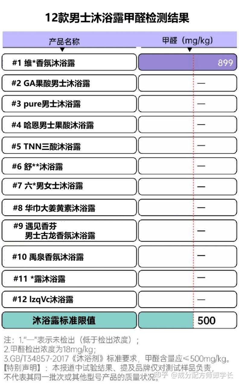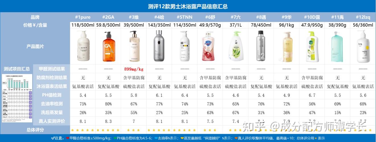 5w+检测费,1.2W+产品采购费。 市面上热门的沐浴露,我们都测了个遍! 市面上的男士沐浴露坑多到吓人,尤其是一些男士功效沐浴露,什么去鸡皮疙瘩、控油去味等,商家铜梁还珠、夸大宣传是常态,肤色测试但总有那么一些良心沐浴露是存在的。 成为配方师之前,我也踩过很多沐浴露的坑,尤其对于我这种前胸后背长痘来说,对无良商家深恶痛绝。 成了配方师之后,实在忍受不了这些商家继续忽悠了! 为了让更多兄弟们少踩坑,少交智商税,我决定通过这个测评,揭露他们试图隐藏的功效沐浴露真相! 看完这篇测评,你可以收获: 本次选品,基本涵盖了市面上各种类型的沐浴露:皂基、氨基酸、复配、祛痘、去异味、去油腻等。 为了更好的帮大家选出靠谱又好用的沐浴露,我们还邀请了8位小伙伴亲身测试 最后留下的沐浴露,都是经过下面重重选拔的! 全文内容较长,没有耐心看完的宝子可以先看精简版,或点击目录到自己感兴趣的方向 全家福及其产品信息在此: 经过成分分析、功效测试、清洁测试、留香测试等多个筛选后的综合结果,我们推荐下面这几款: 1、pure沐浴露,测试中发现可以高效除螨抑菌,止痒祛后背痘,对家中养宠物的人很友好 2、GA果酸沐浴露,测试发现在清爽控油去味方面效果很好,而且能深层疏通毛孔,保持皮肤持久干爽 3、TNN三酸沐浴露,测试中发现能够改善皮肤粗糙,酸性成分有温和剥落鸡皮角质的作用,细腻光滑皮肤 具体检测步骤,感兴趣的兄弟们可以往下戳▼ · 双咪唑烷基脲和DMDM乙内酰脲 这两类防腐剂属于[甲醛释放体类防腐剂代表],具有潜在的致突变物。 国标GB/T 34857-2017《沐浴剂》规定,沐浴露产品中甲醛含量应≤500mg/kg。 欧盟则于2021年10月修订了关于化妆品中甲醛释放剂标签的规定,要求甲醛浓度超过10mg/kg,所有含有甲醛或甲醛释放物质的成品必须贴上警告标签“含甲醛”。 基于此类风险,甲醛检测是务必要进行测试的▼ 检测甲醛报告的时间为:3天邮寄 甲醛检测费:2000元 检测结果: 经检查有一款沐浴露甲醛严重超标,甲醛含量超出沐浴露国家标准约1.8倍,为不达标。 此外,我们调查发现沐浴露的包装成分表中含有DMDM 乙内酰脲的,也会释放出微量甲醛,所以大家看成分表的时候一定要注意该成分 · 甲基异噻唑啉酮/甲基氯异噻唑啉酮 这2类防腐剂都具有强致敏性,欧盟已经禁止把它用在防晒霜、身体乳、面霜等驻留化妆品中,同时也下调了甲基异噻唑啉酮在淋洗类产品(比如洗发水、沐浴露)中的最大使用量。 我国《化妆品安全技术规范》(2015年版)规定,甲基异噻唑啉酮的限量为0.01%,卡松限量为0.0015%。 测评小结: 我们通过观察沐浴露产品成分发现:以下几款均含有此类防腐剂,皮肤敏感,或者有痘痘、瘙痒的皮肤要注意了 其他8款沐浴露均为检查出含有刺激防腐剂成分,成分安全,可以放心使用。 我们常见说的清洁表活有三种:皂基类、氨基酸类、硫酸脂类 其中我们在选购沐浴露的时候,一定要注意规避月桂醇硫酸酯钠(SLS)、椰油酰胺DEA这种刺激性比较强,敏感肌在使用时可能会出现泛红、刺痛的不适症状。 (图片可能引起不适,谨慎观看) 测评小结: 其中我们测评的沐浴露中,#6款、#7款、#10款含有月桂醇硫酸酯钠;#3含有椰油酰胺DEA,皮肤容易过敏的兄弟们需要注意了,也许你不是因为出油长痘,而是用错了清洁表活。 Ps:功效测试包含清洁力、PH、留香时长等多个测试小节,是非常重要的沐浴露测试环节,感兴趣的兄弟要耐心看完哦! pH值是衡量某物酸性或碱性(碱性)程度的量度,pH值代表溶液中氢离子的数量。 PH值以7值为中性,数字越小,酸性越强;反之数字越高,碱性越强。 而人体皮肤的PH值往往在4~6之间,这也就意味着,沐浴露一旦过酸或过碱,都会对皮肤有一定破坏 PH值检测仪器:实验室专用的检测仪器,比PH值测纸更加精准,检测时需要停留30s 沐浴露如何检测:沐浴露各挤出一泵量于烧杯中,加100ml水搅拌均匀,电极用蒸馏水冲洗后,再放入稀释后的烧杯中,等PH数值稳定后,记录沐浴露PH值 12款沐浴露PH检测结果如下: 对男生来说清洁能力一定是最重要的!尤其是前胸后背长痘、爱运动、出油大的男生来说。 否则身上黏糊糊难受不说,还有汗味、油脂味等异味,影响别人对自己的感官。 检测仪器:德国 CK MPA-580 多探头皮肤测试系统 检测方式:因为季节的原因会导致身上的皮肤出现不同状态,有时候出油少,有时候出油多,并且额头部位没有衣物,减少因衣服导致的变量。 所以我们为了让测试更加精准,选择在志愿者脸上相对“抗造”的额头区域进行测试! 志愿者使用样品前后皮肤表面的油脂量,然后计算洗前/后20分钟的额头油脂变化量,得到样品的去油率,也就是清洁能力。 检测结果如下: 对照发现#1pure、#2GA、#4哈恩、#5TNN、#6舒肤佳、#8遇见香芬、#9华巾大等沐浴露在控油去油方面更胜一筹。 看重清洁能力的「大庆油田」们,或是盛夏季节用的,就可以多多考虑这种控油去油方面的沐浴露。 PS:虽然12款样品的数值有高低差异,但并不代表数值低的就洗不干净,它们基本能满足大部分人的日常清洁需求。 先给大家辟个谣:沐浴露作为一款清洁产品,是不能保湿的,而我测试的这项的目的是检测[洗后皮肤会不会拔干] 因为只有沐浴露中添加了保湿成分(比如霍霍巴籽油、透明质酸钠),洗完后皮肤会相对水润些。 当然,如果非要矮个子里拔将军的话,也可以说