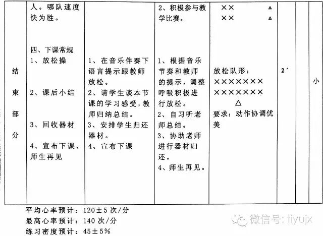 (三)结束部分:教师采用简单的放松动作,配合音乐,示范引领,带领学生调整呼吸和身心,使学生身心逐渐恢复到相对稳定的状态。然后进行语言总结与评价,和学生交流心声,体验成功的喜悦,分享教学收获。