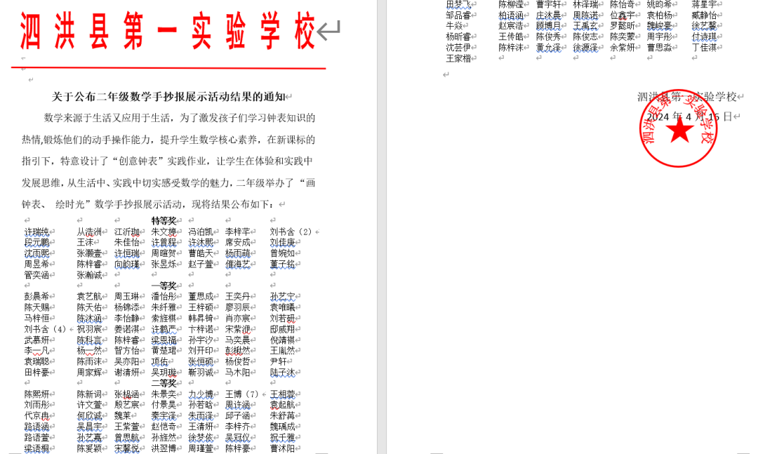 本次活动是一次非常成功的数学体验活动。经过激烈的竞争,共评选出特等奖30名,一等奖56名,二等奖78名。获奖结果公布如下: