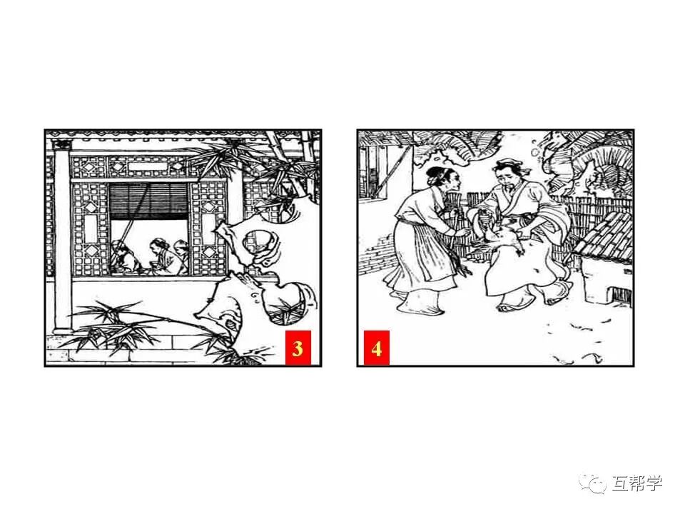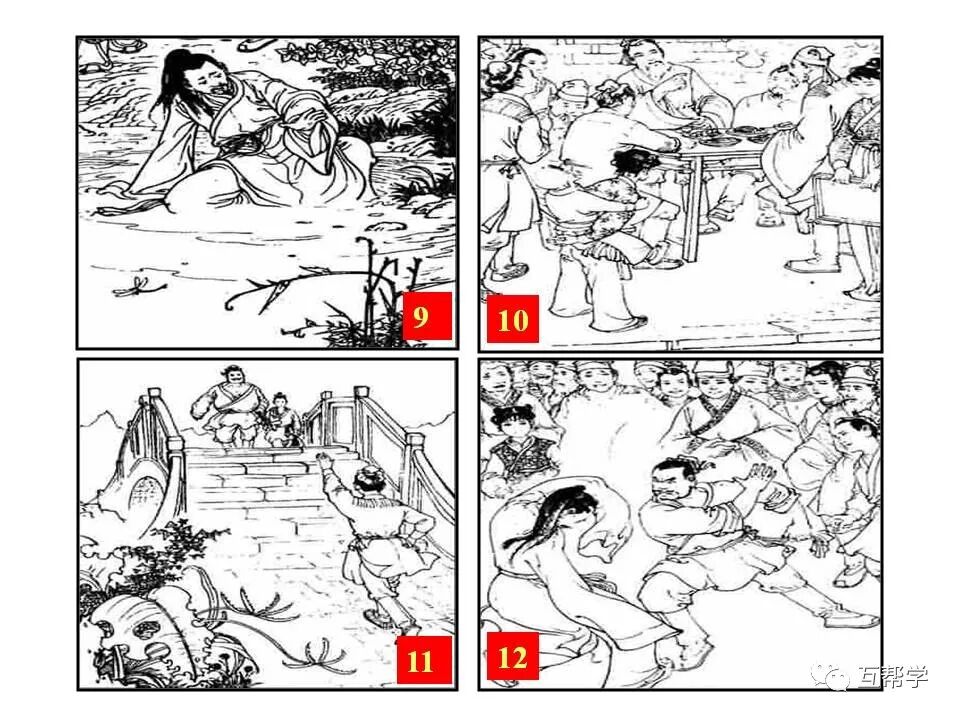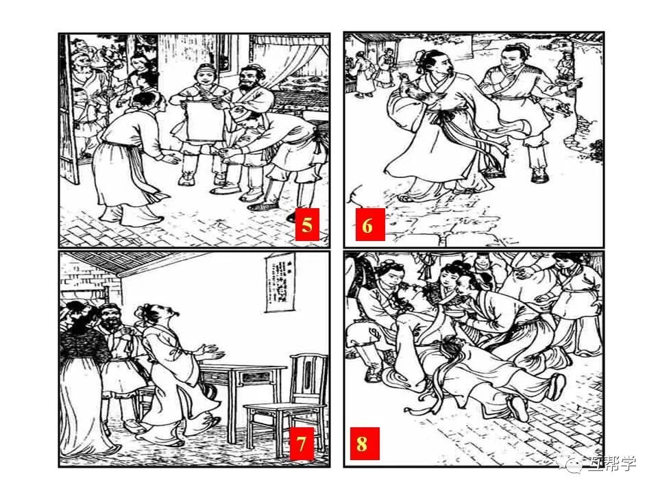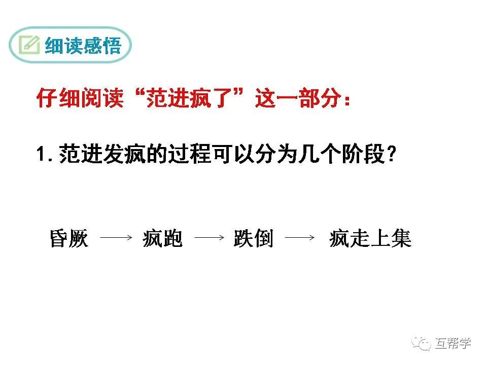 第二部分(③—⑩):写范进得知自己中举后喜极而疯,众人请胡屠户出面打了范进一个耳光,范进因而得以清醒,然后和众人一同回家。