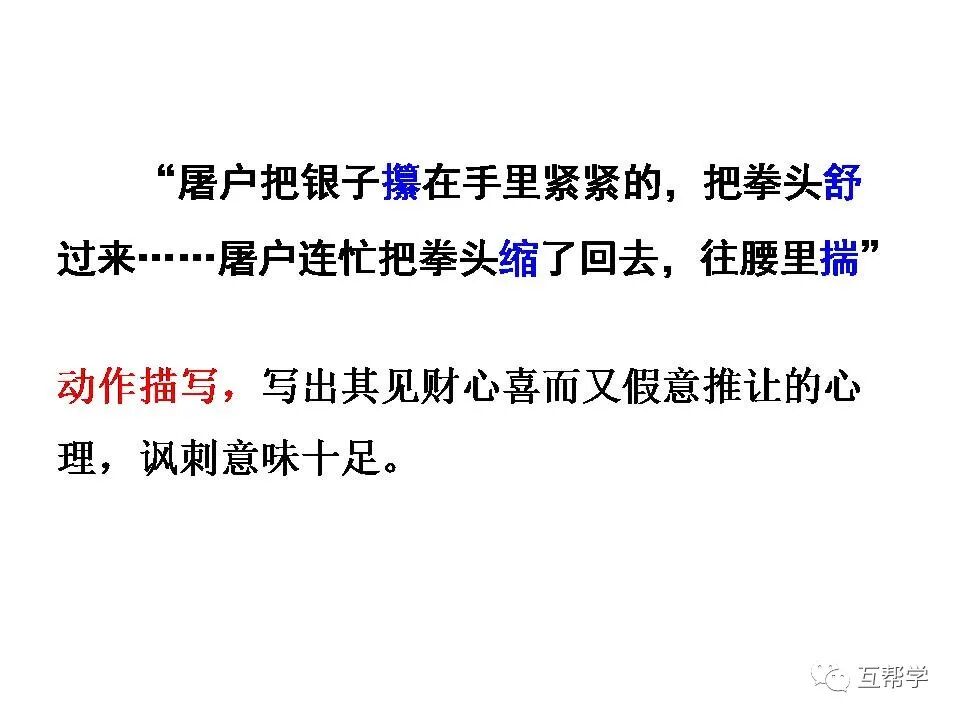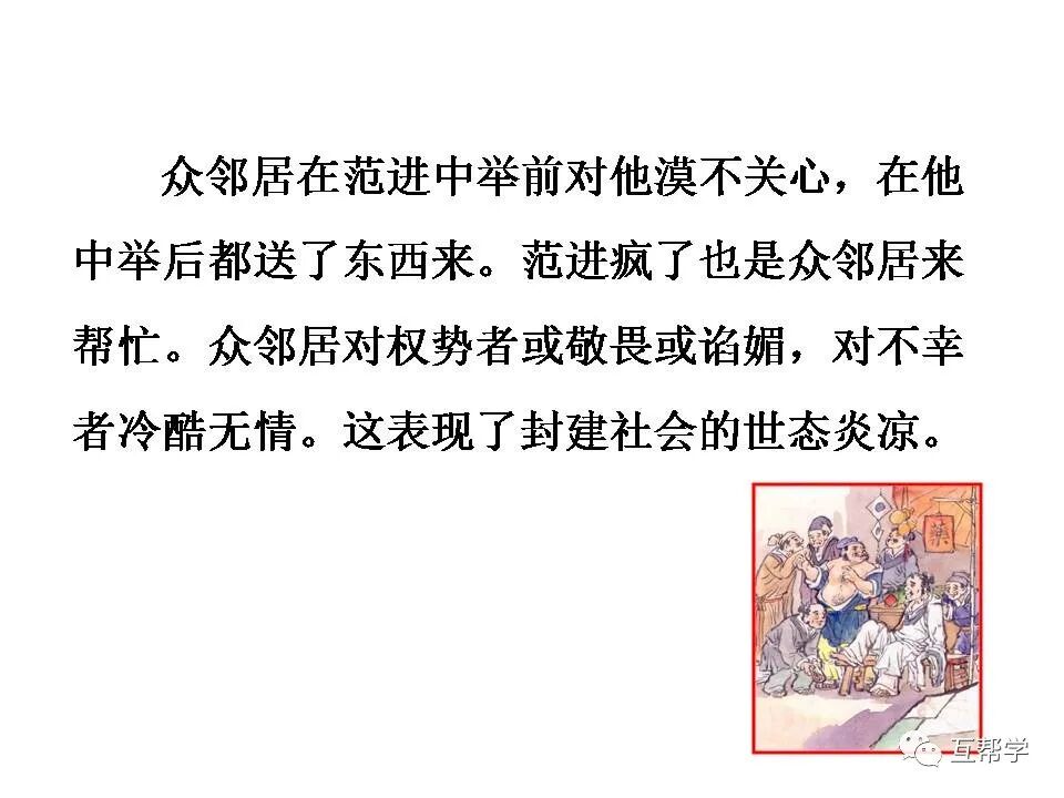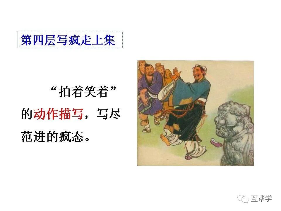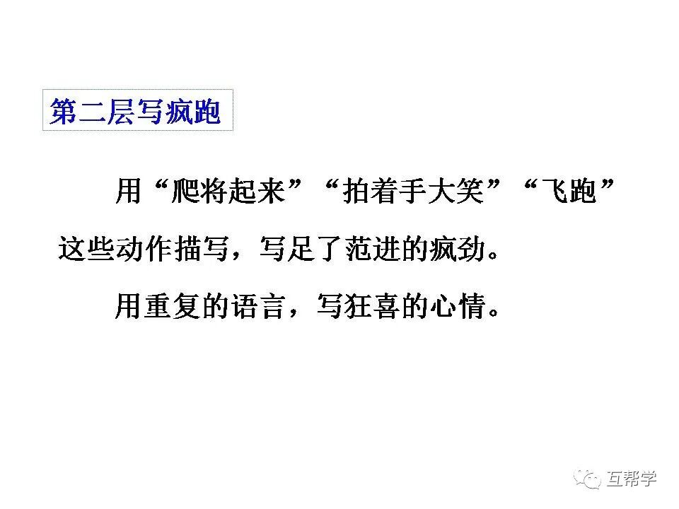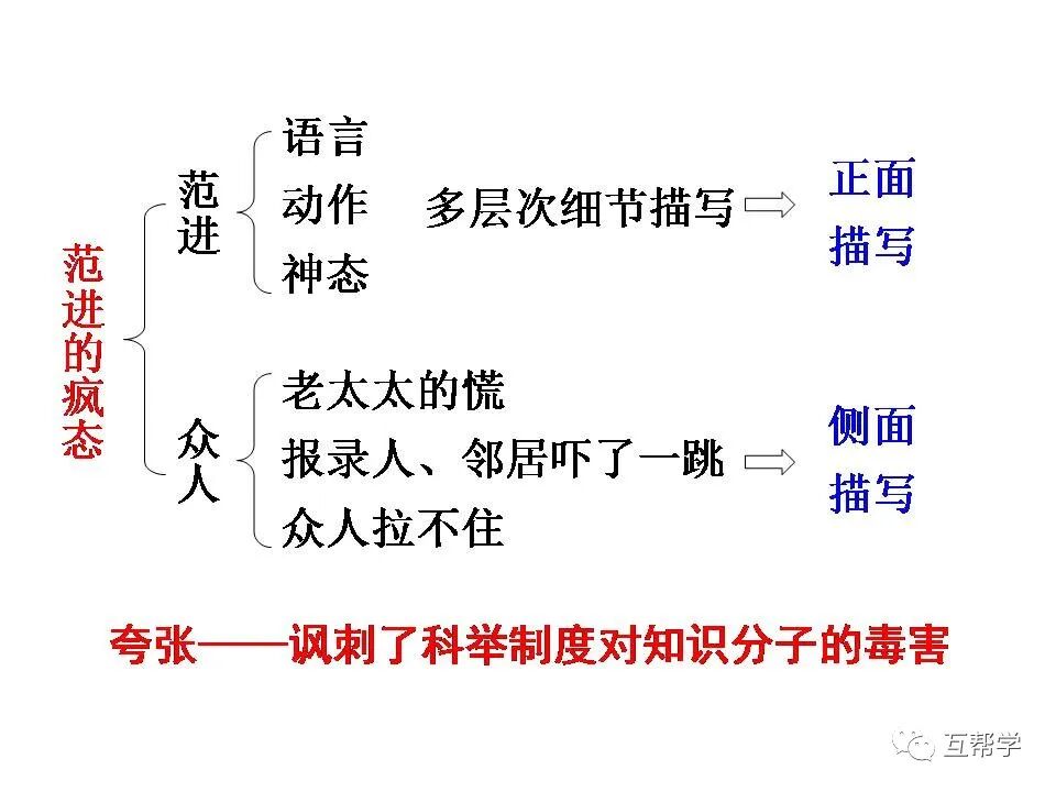 如:“老太太慌了”烘托范进昏厥的吓人。“报录人和邻居都吓了一跳”烘托范进飞跑的疯狂。“众人拉他不住”烘托范进疯劲之大。