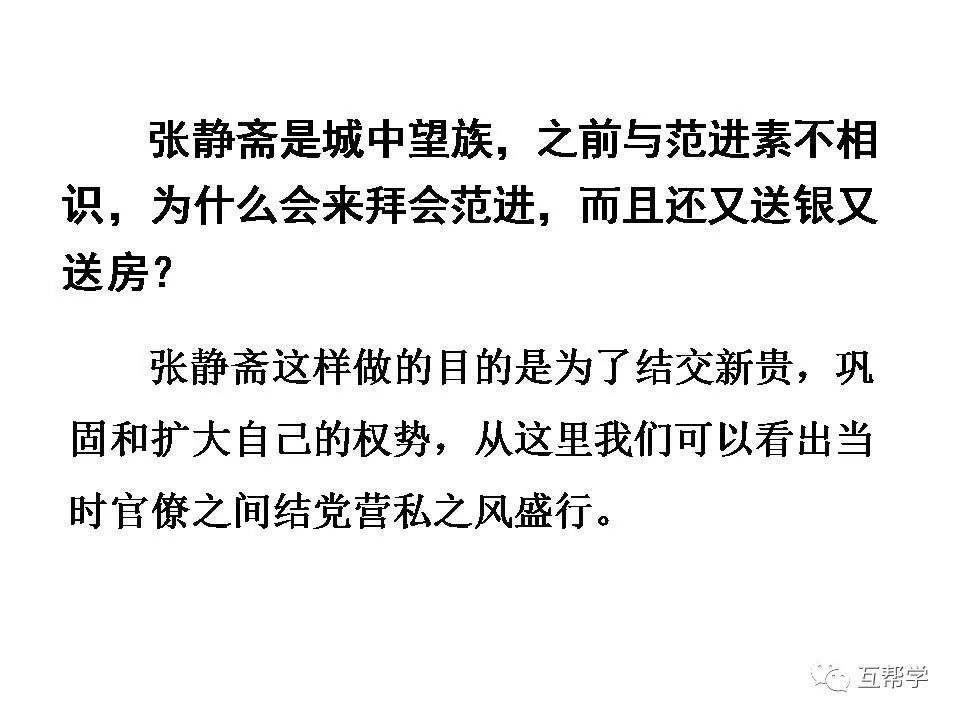 第三部分(11-12):写范进中举后张静斋闻讯即刻前来拜访,又是攀认世弟兄,又是送银子送房子,极尽恭维拉拢之能事,进一步展示出当时的社会风气。