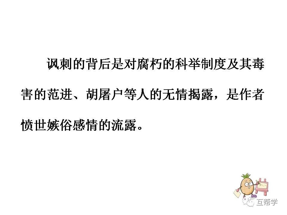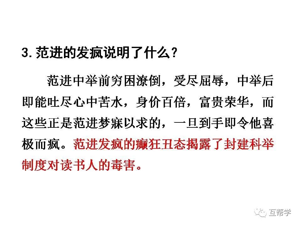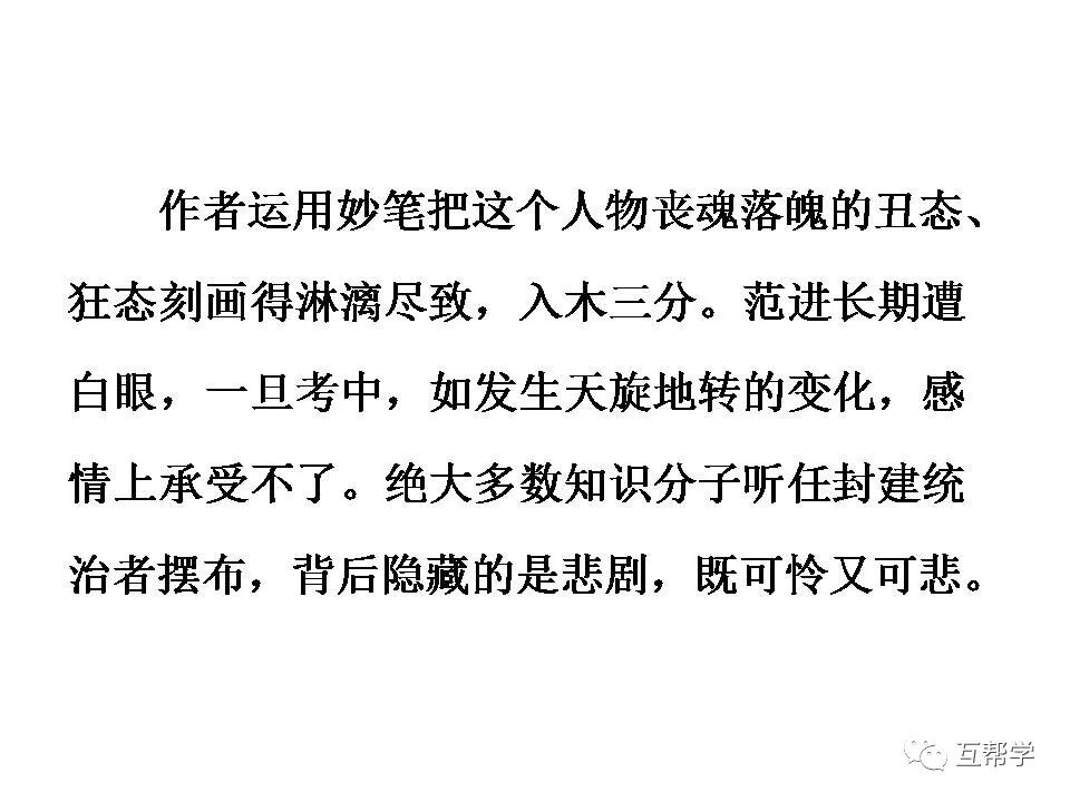 “打他一个嘴巴”是作者对封建科举制度极端痛恨的情感流露。范进热衷于功名,以致发疯。他是封建科举制度的信奉者。这一巴掌打在范进脸上,却印在科举制度的“心”上。这正是作者对封建科举制度的无情鞭挞。