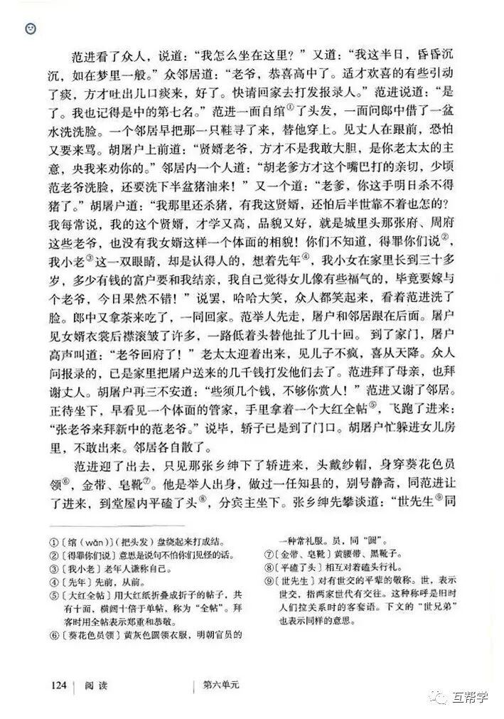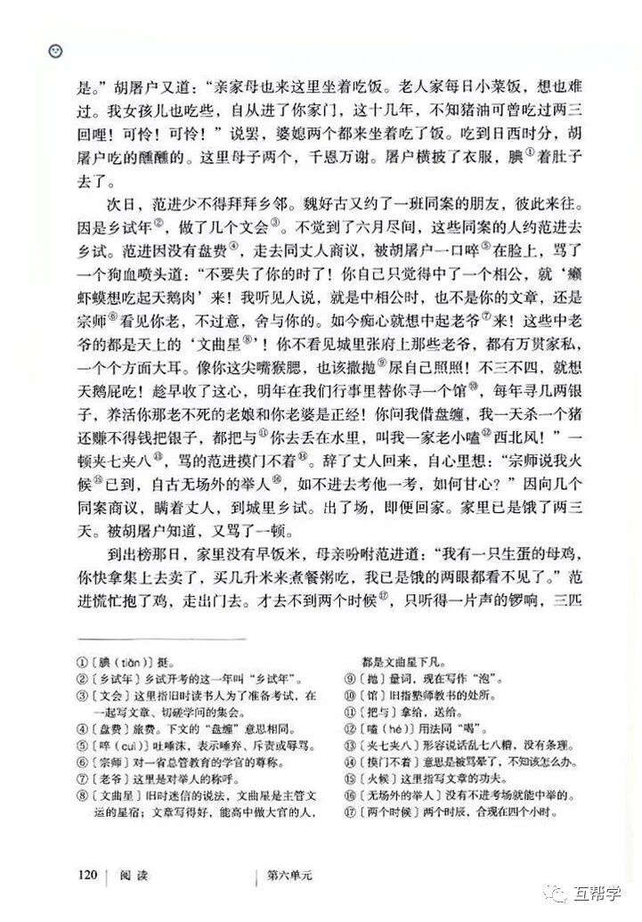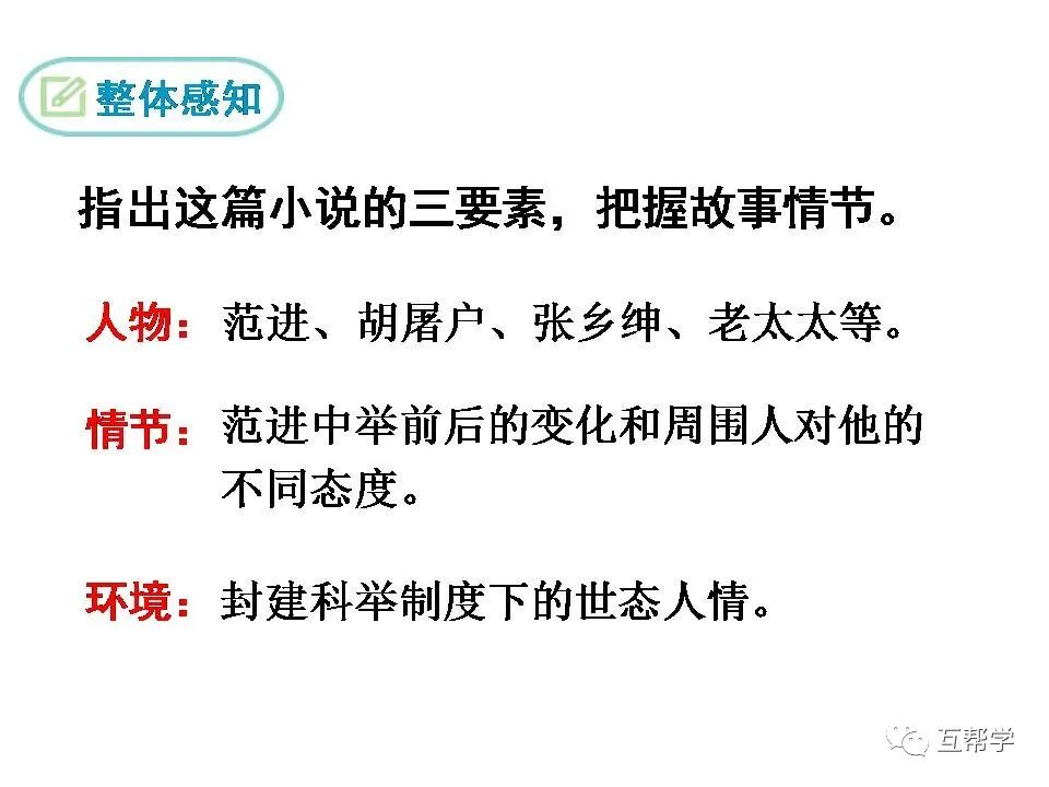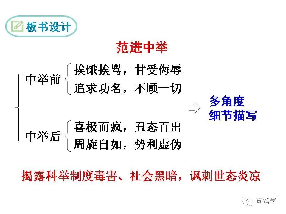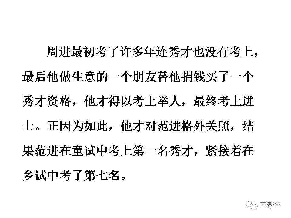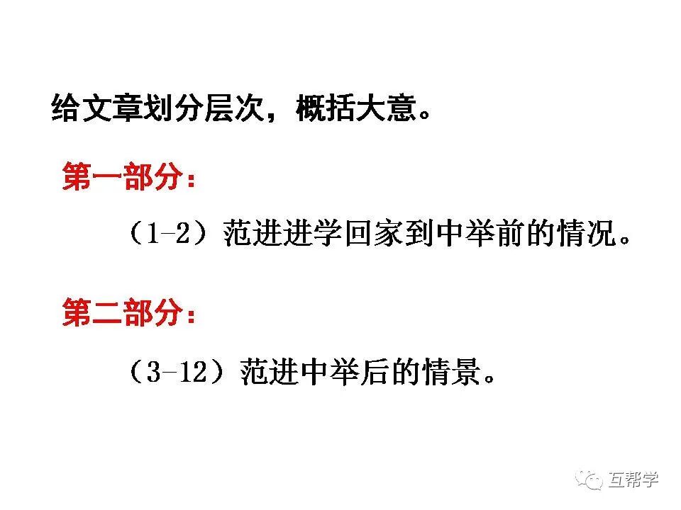 第一部分(①②):写范进进学回家到中举前的情况———穷困潦倒、受尽侮辱。