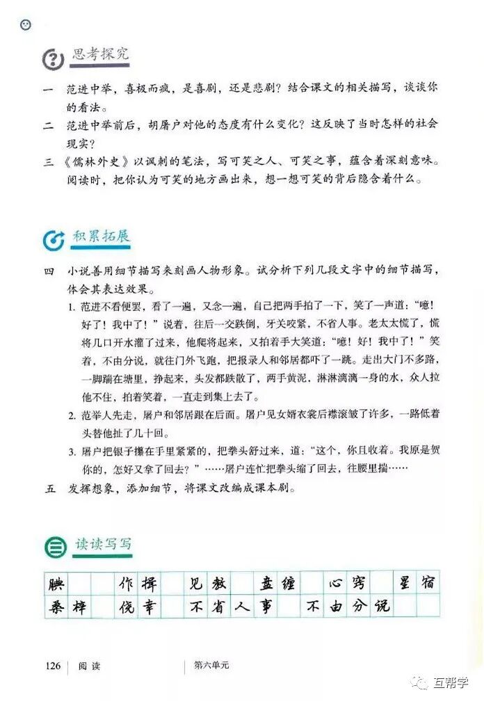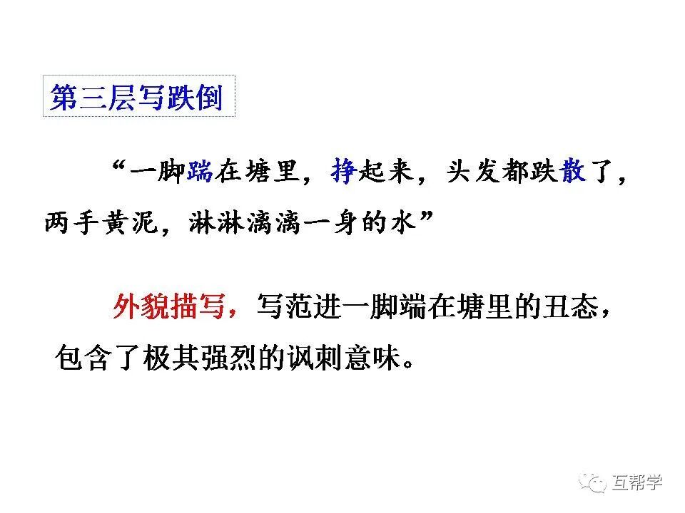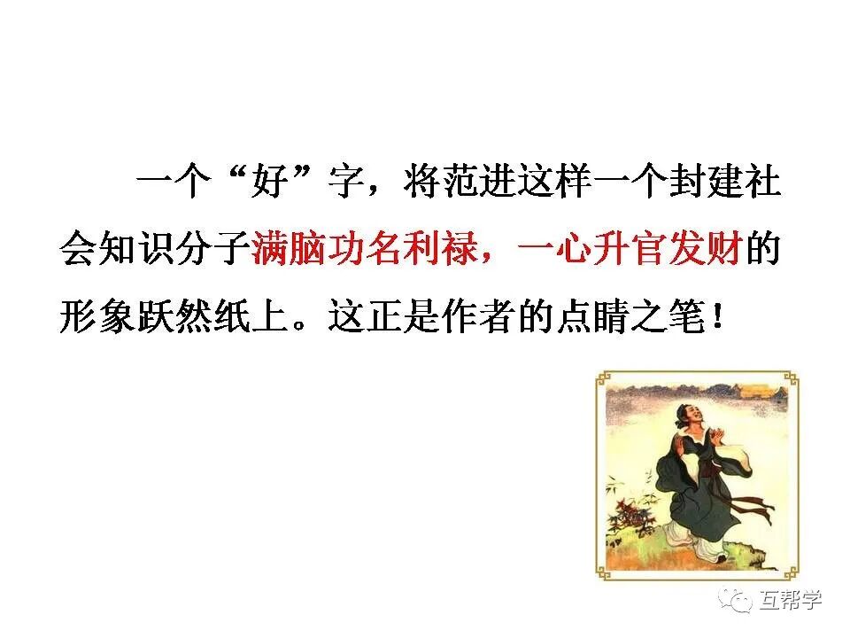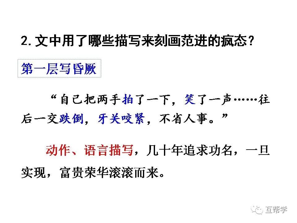 用“看”“念”“拍”“笑”写范进喜极的动作,用“往后一交跌倒,牙关咬紧,不省人事”写范进昏厥的动作、神态。语言描写中“噫”写出惊喜过望的心情。“好了!”突出表现了心满意足的心情。反映了他几十年来追求功名富贵达到了神魂颠倒的地步。