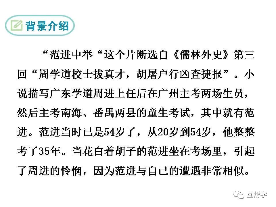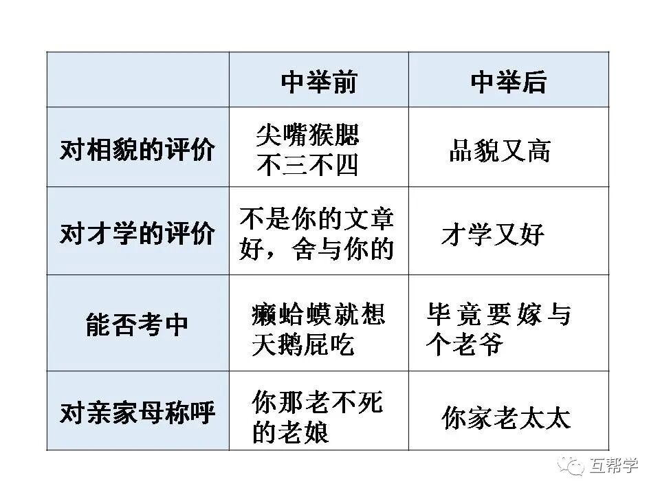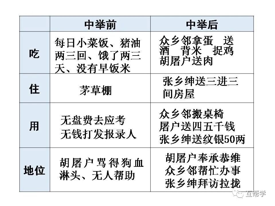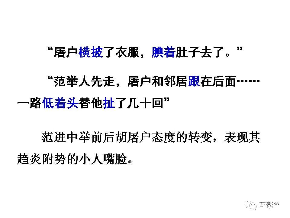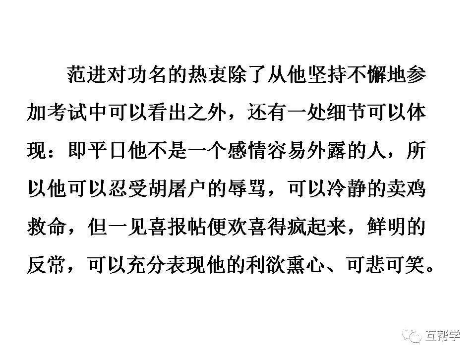 如“这十几年,不知猪油可曾吃过两三回”“家里已是饿了两三天”几句可见范进家境贫寒,面对屠户的训骂,他竟然“唯唯连声”,可见他社会地位低下。在这种情形下,他仍偷偷赴试,更表现出他对功名的热衷。