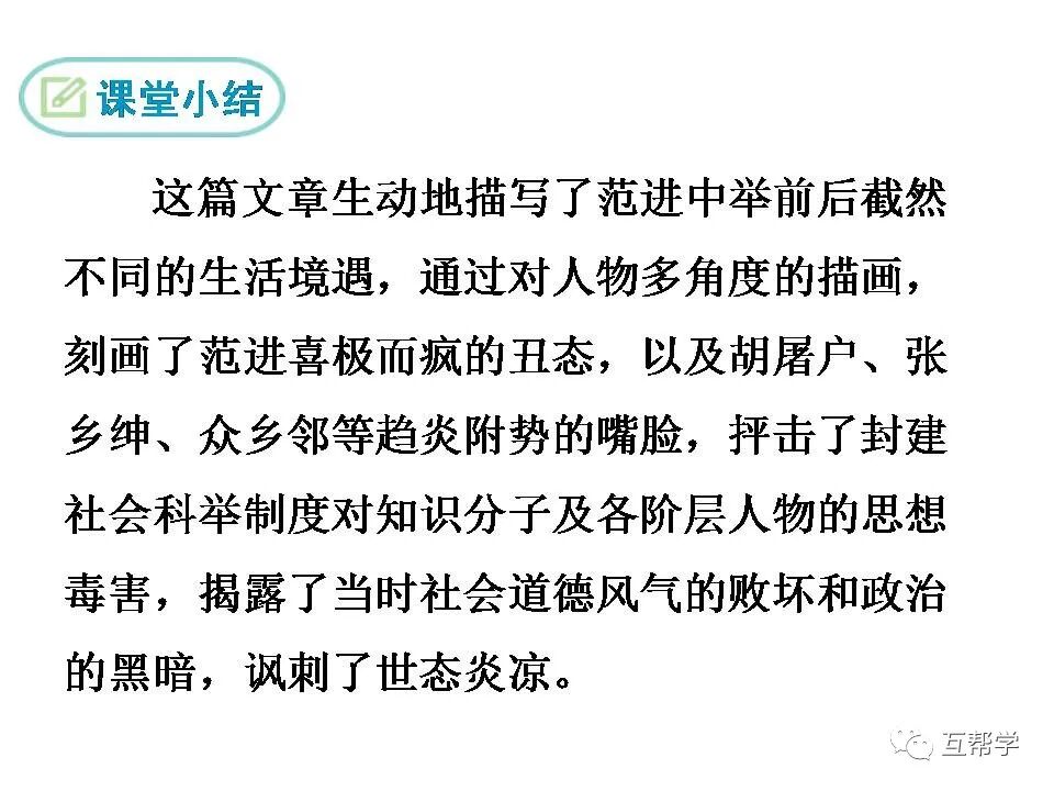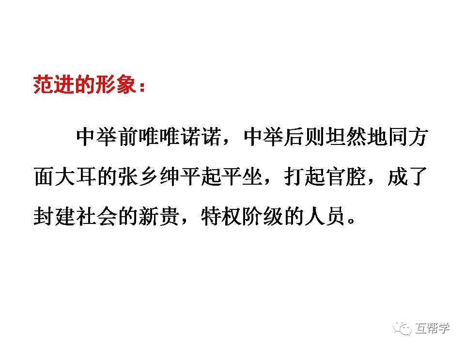 作品通过描写这两个人物对待范进的态度,从侧面揭示出范进这类知识分子之所以如痴如狂地追求功名的最终目的,就是要使自己成为被巴结、奉承、攀附的权贵,进一步暴露了他们腐朽的灵魂。这两个人的语言和行动更反映了当时社会趋炎附势的风气,使作品的锋芒不仅指向科举制度,也指向整个社会,从而进一步深化了主题。