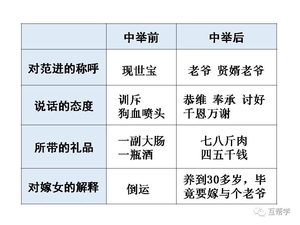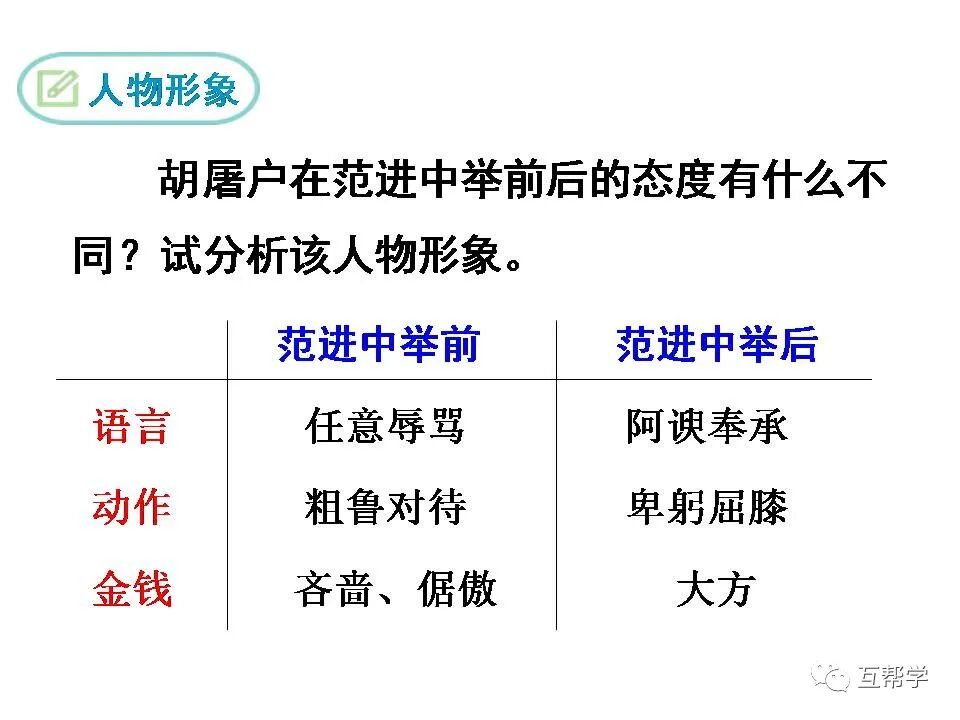 范进赠银给胡屠户,胡屠户喜极而归,与先前“母子两个,千恩万谢。屠户横披了衣服,腆着肚子去了”形成鲜明对比,活画出了胡屠户的虚伪、贪婪,也从侧面反映了中举给范进带来的巨大变化。