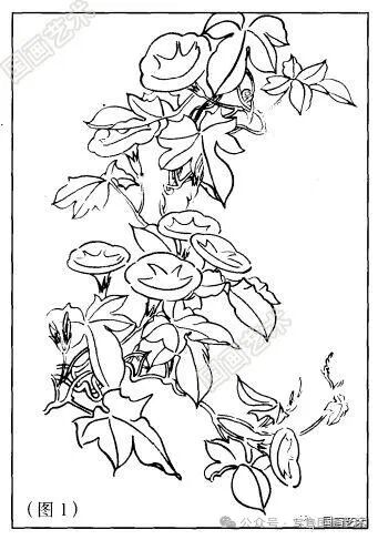 画一些牵牛花的速写,了解其结构非常重要。在写生的基础上,用勾勒方法画出白描稿,线条要均匀、有力、挺拔,这样,一方面可加强对牵牛花结构整体的认识,另一方面也可积累创作素材。