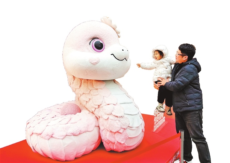 1月25日,在许昌市胖东来金汇店超市内,市民在与卡通蛇互动。吕超峰 摄