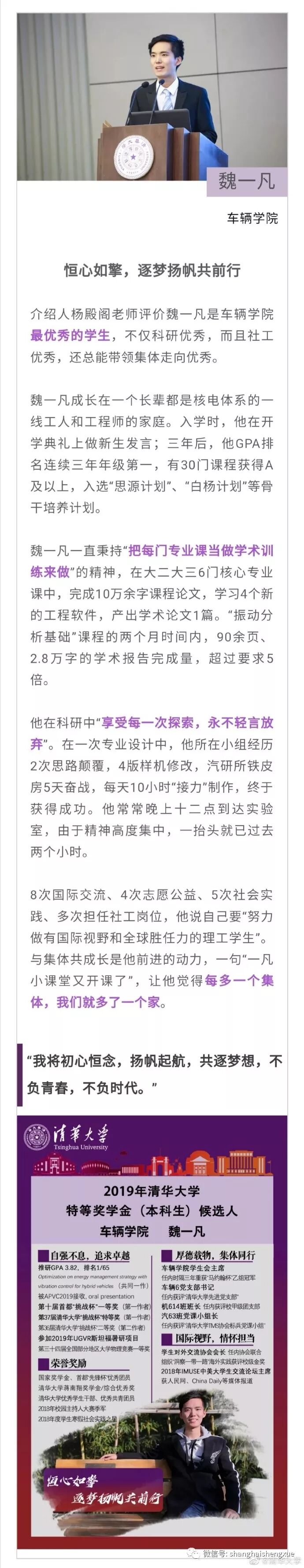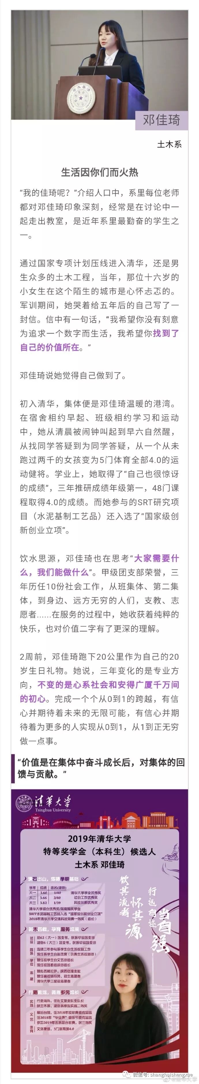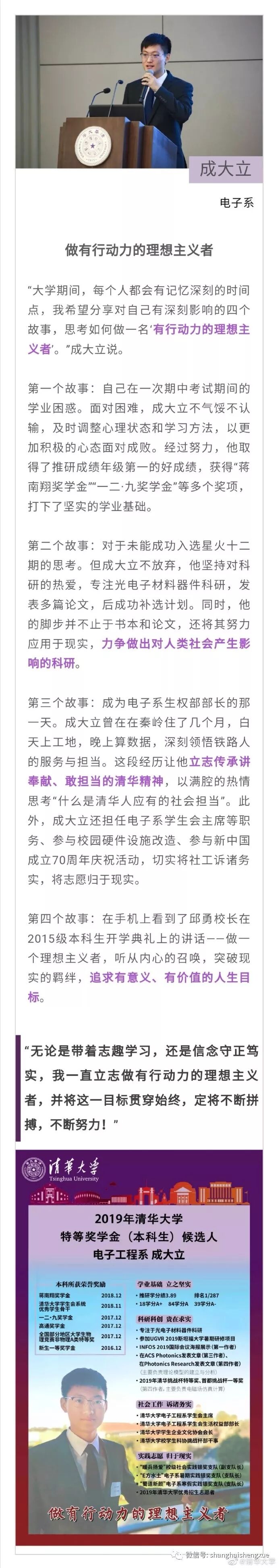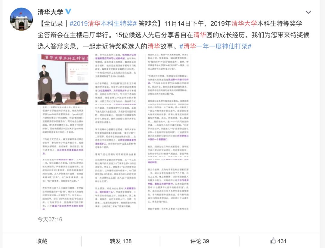 据清华大学微博消息,2019年清华大学本科生特等奖学金答辩会近日举行。15位候选人先后分享各自在清华园的成长经历。