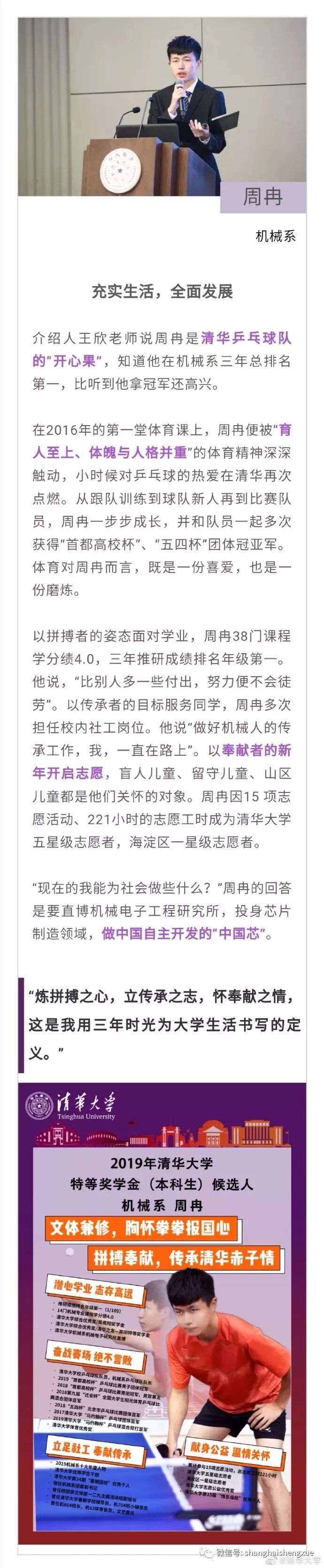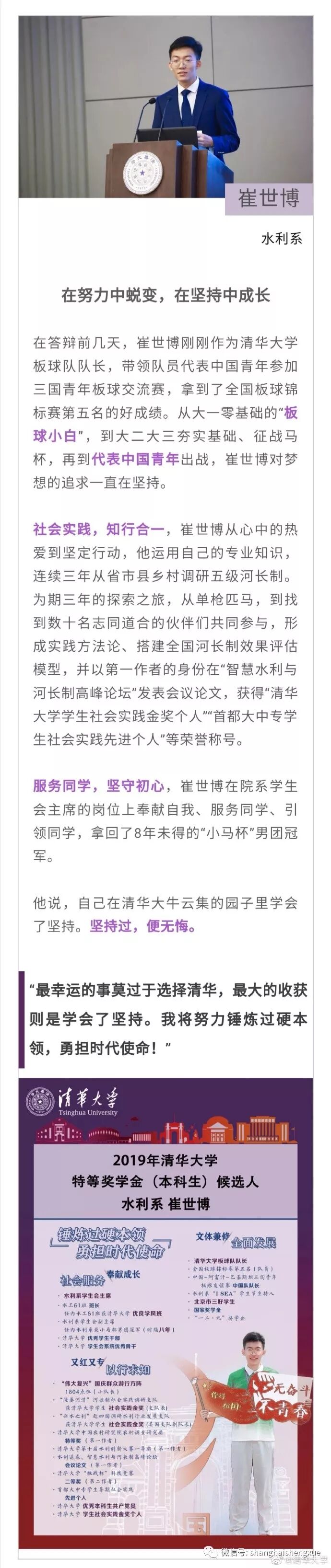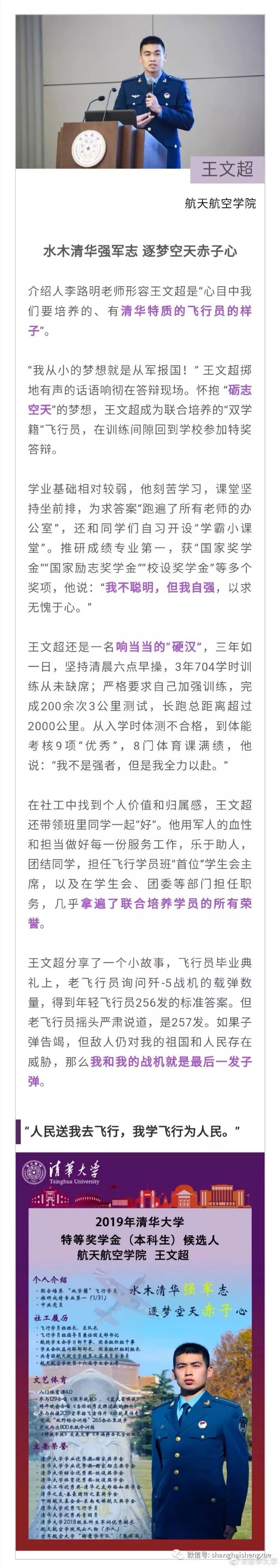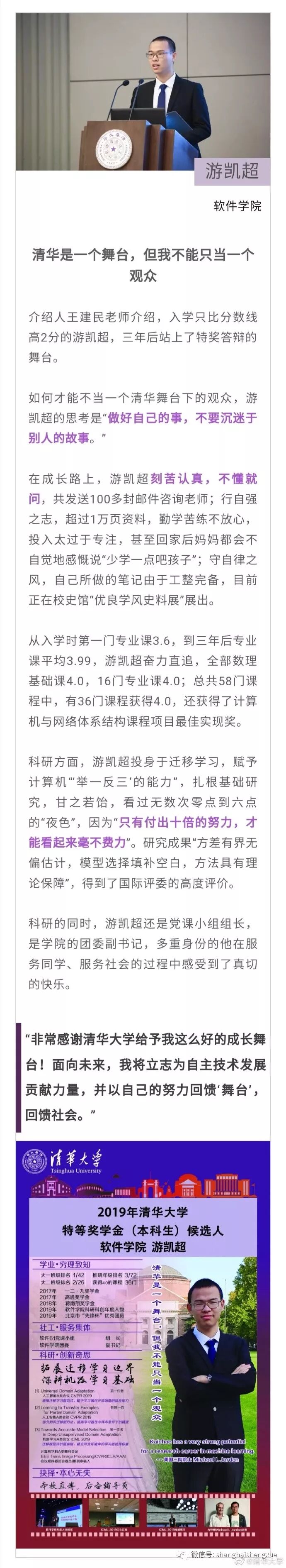据清华大学微博消息,2019年清华大学本科生特等奖学金答辩会近日举行。15位候选人先后分享各自在清华园的成长经历。