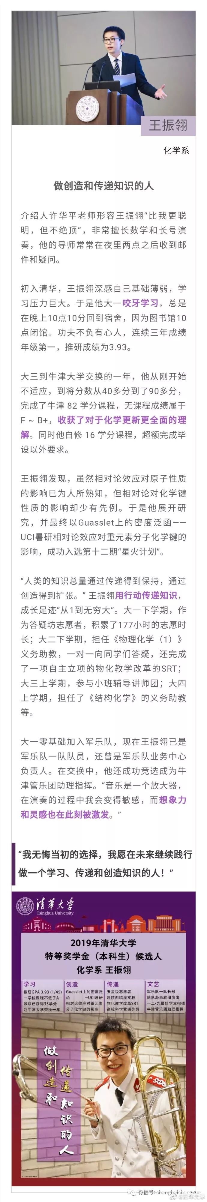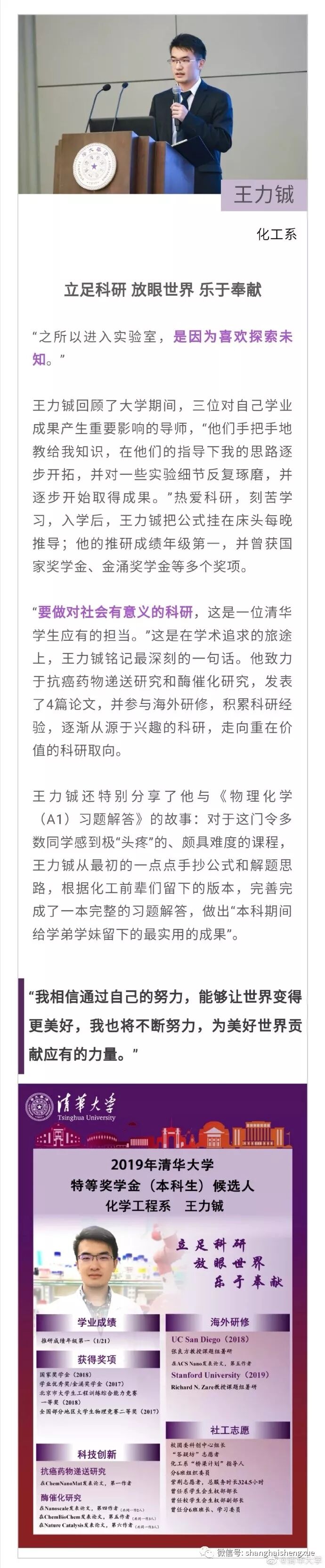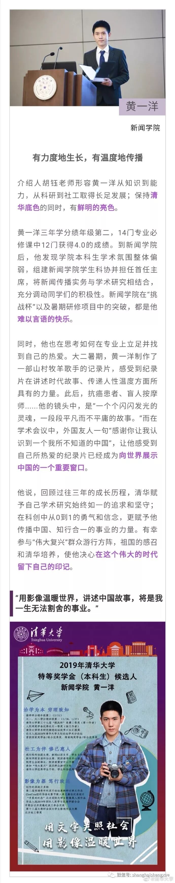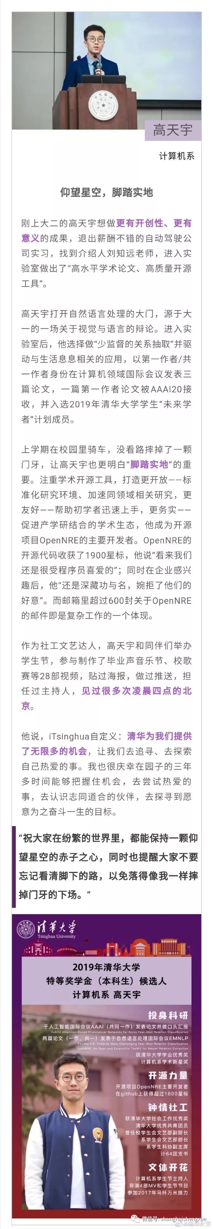 据清华大学微博消息,2019年清华大学本科生特等奖学金答辩会近日举行。15位候选人先后分享各自在清华园的成长经历。