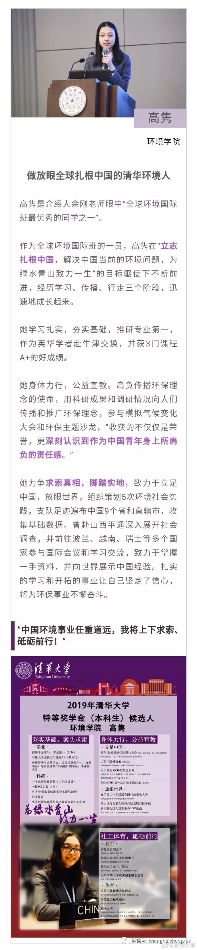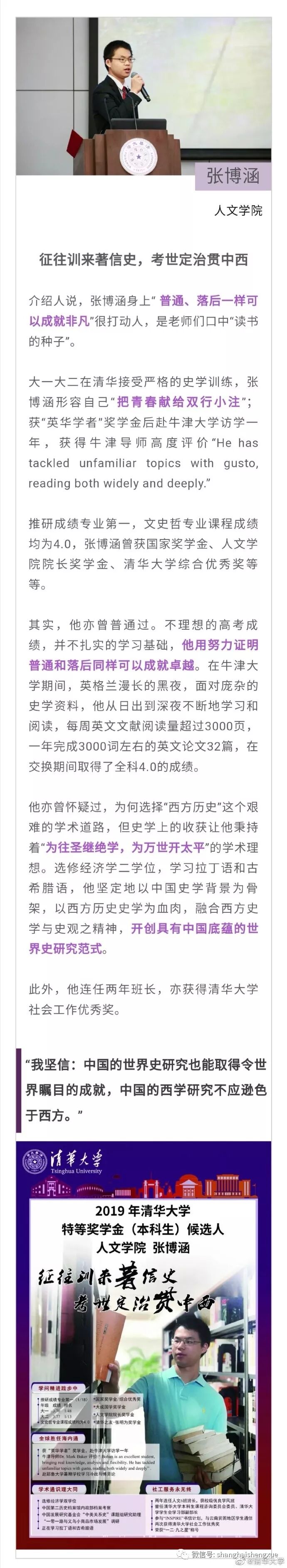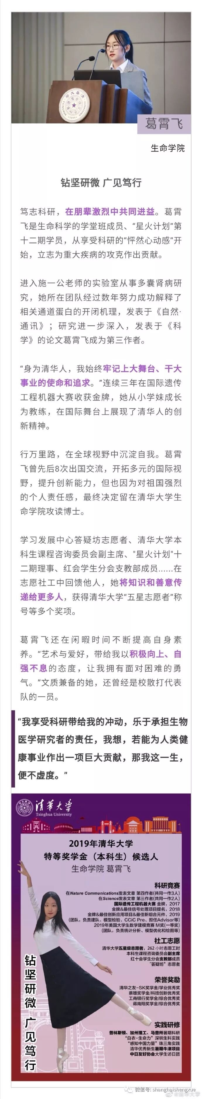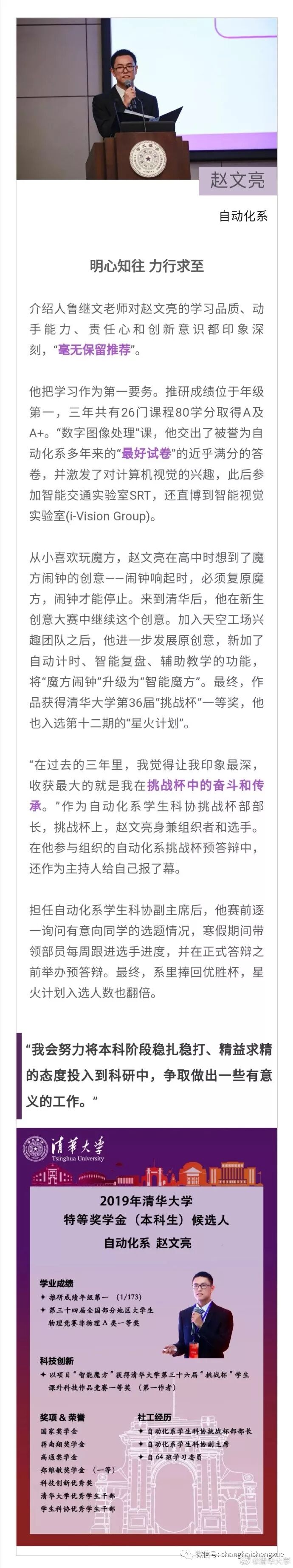 据清华大学微博消息,2019年清华大学本科生特等奖学金答辩会近日举行。15位候选人先后分享各自在清华园的成长经历。