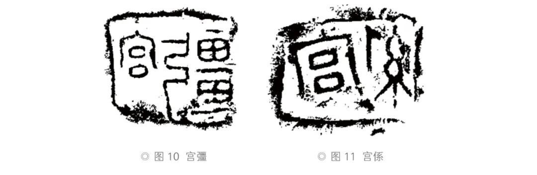 第一,秦始皇帝陵兵马俑身上形态怪异的抑印陶文,如“宫彊”(图10),“宫係”(图11),以及“係”“宫得”“得”“宫欬”“宫宫欬”“宫臧”“臧”“宫穨”“宫颇”“颇”“宫巍”“宫朝”“宫”等,在陶质兵马俑表面大部分为凸起阳文,也有凹下阴文。秦始皇帝陵区内出土的陶器的抑印陶文,如“丽山飤官”(其内容相同的既有抑印陶文也有刻划陶文)等,都应当属于大统一时期的作品。