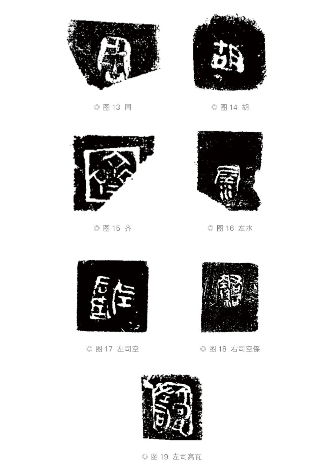 大一统秦帝国时期的抑印陶文,从临潼、渭南、咸阳、西安等地的出土情况来看,包含中央职官名的内容猛然增加,比如“左水”(图16)、“左司空”(图17)、“右司空係”(图18)等。需要注意的是,笔者暂且将以上内容放在秦统一之后,但也可能在秦统一前已经出现,今后还需要更细致地加以分辨。不过,秦始皇陵兵马俑身上出现的一批面目怪异的抑印陶文,仅就印面分析,有陶、石、木质的;再就印面面形分析,少见有方形、块形,多不规则形,还见到一枚瓶形,与千年之后的元押相呼应;这是因“物勒工名,以考其诚”,工匠们为了表示个人的负责态度用陶片、石片或者木片制成印章加盖在兵马俑身上的产物。以“宫某”为代表的抑印陶文与前两期的陶文存在绝大的不同,大部分原印印文为阴文(白文),其打在陶俑身上呈现出凸起的阳文风格,别具风貌;也有少量原印印文为阳文,其打在陶俑身上呈现出凸起的阴文风格。