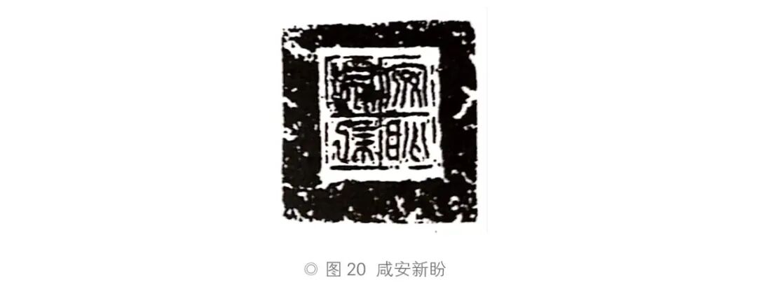 第五,印面细部处理不同,一般秦印上出现的田字格、日字格等在秦抑印陶文当中很少见到,如“咸安新盼”(图20)很像秦泥封,所用之原印也与秦大部分存世玺印一致。秦的四字印尤其是官印,存在交叉读、旋读等现象,笔者认为这是出于保密或换印制度的需要,而这种现象在秦抑印陶文中几乎没有出现过,当然存在“咸安新盼”这样的个别例外。
