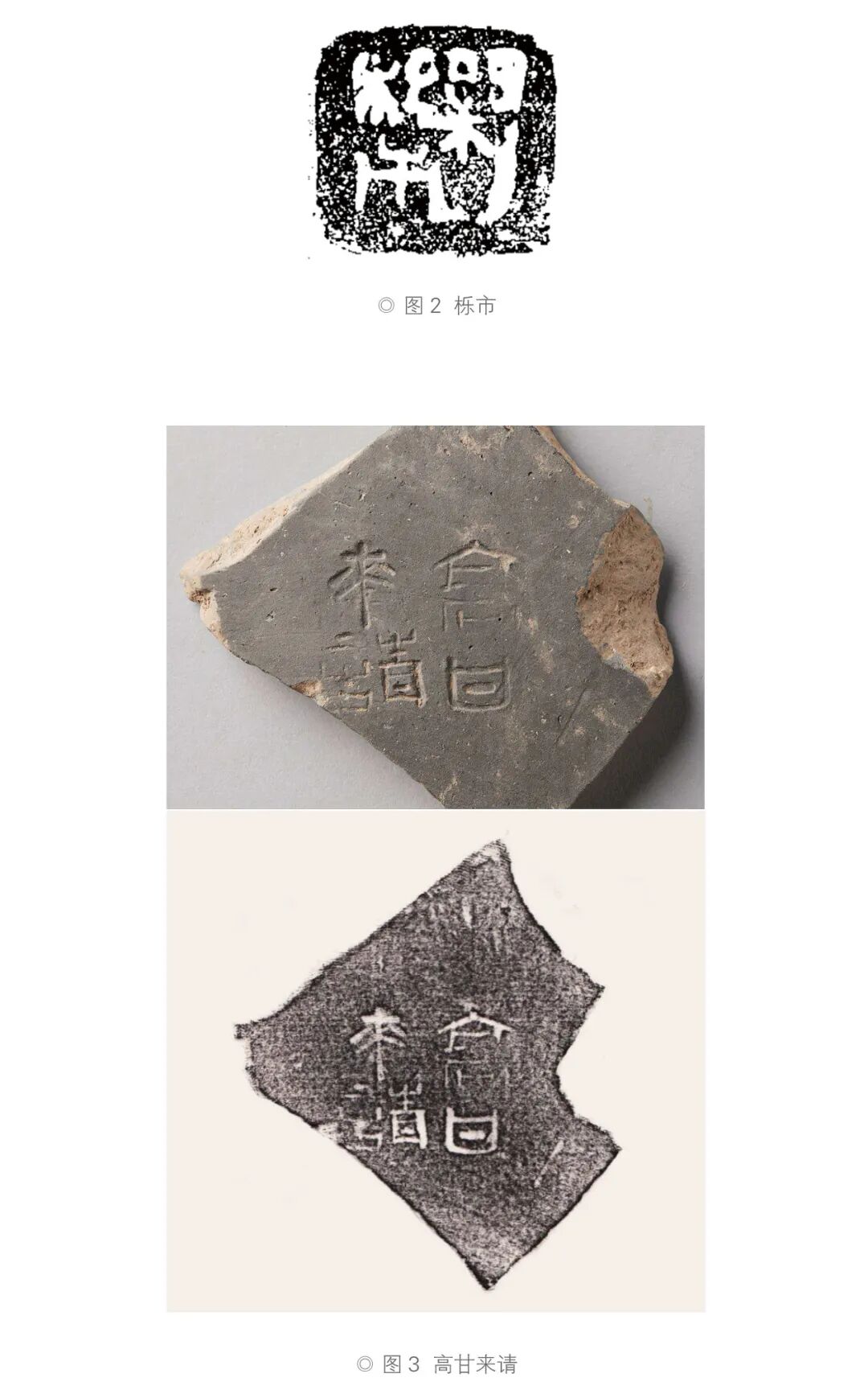 秦抑印陶文在本阶段的标准器便是“栎市”陶文(图2)了,此种陶文有多种版别,在长安、咸阳、渭南等地也有“栎”“某市”一类的陶文出现,可能也属于这一时期。这些陶文一般表现得大度、粗拙、排字挪让随意,其字体基本是小篆,这与后来的“摹印篆”有很大区别;原印的印面较大,以阳文为主,抑印在陶器上为凹下的阴文。值得注意的是,笔者通过刘瑞教授见到了一枚战国秦地层出土的“高甘来请”四字抑印陶文(图3),其具体含义尚不明确,但从其文字表达来看,字口深浅不同,单字之间存在位移,这种情况应当是四个单字印逐一戳盖造成的,这种例子以往极少见到。
