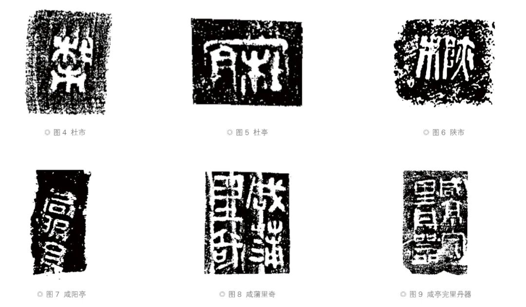 第二,散布到河南、山西、山东、四川、两湖、华北等地的秦抑印陶文,陕西西安(包括区县)出土有“丽市”“丽亭”“频”“频阳”“奠亭”“高市”“茝”“槐里市久”“将行内者”等;陕西淳化出土有“云市”“云亭”等;陕西渭南出土有“宁秦”等;陕西陇县出土有“阿亭”“亭”等;陕西扶风、眉县出土有“犛亭”“美亭”等;陕西商洛出土有“雒市”“楚里孙”等;陕西清涧出土有“杜市”;陕西黄龙出土有“雕阴”;甘肃崇信出土有“卤市”等;河南洛阳出土有“河市”“河亭”等;河南三门峡出土有“陕亭”“陕市”等;湖北安陆出土有“安陆市亭”;内蒙古赤峰出土有“亭印”;山西侯马、翼县、夏县、朔县出土有“降亭”“安亭”“马邑市”等;河北邯郸、永年、容县出土有“邯亭”“易亭”等,有圆形抑印;山东济阳、邹平、巨野、兖州、滕州出土有“安阳市”“市”“亭久”;安徽阜阳出土有“女市”等;还有出土地点不明的标本“临亭”“淄亭”“临淄市”“临淄亭久”“代市”“襄阴市”“荥市”“许市”“曹市”“茬市”“都市”“东武市”“南乡之市”“新绛亭久”等。其中有些在统一进程之中已经出现,但大部分应当是秦统一之后的遗物。